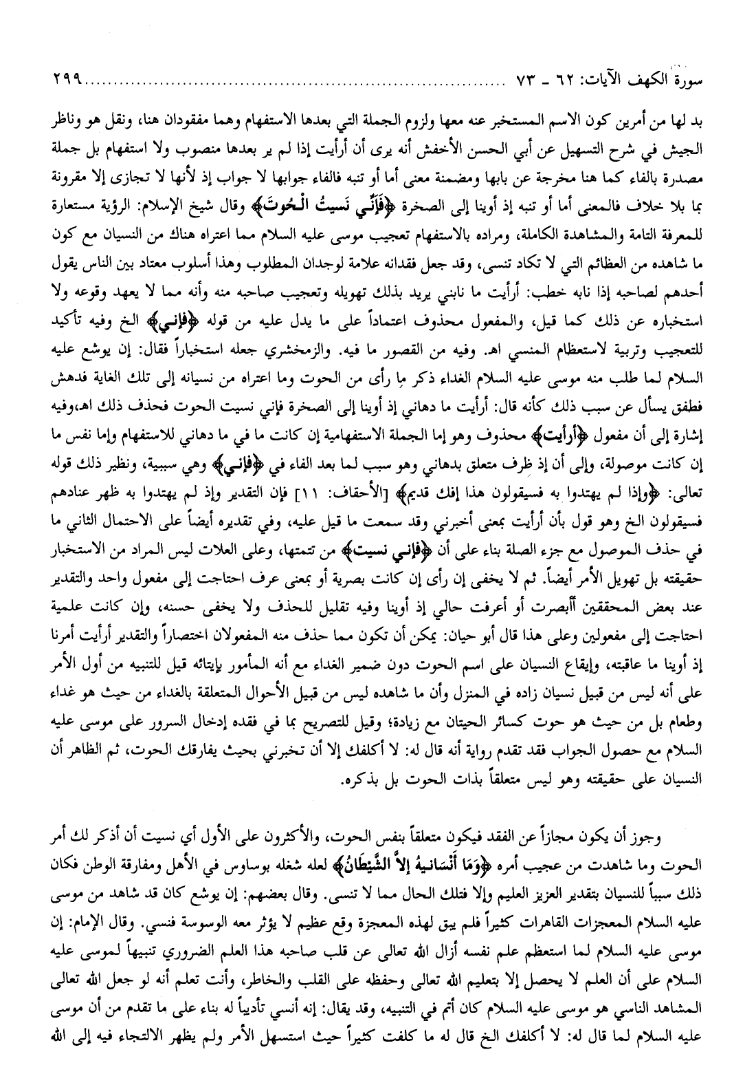 وجوز أن يكون مجازا عن الفقد فيكون متعلقا بنفس الحوت، والأكثرون على الأول أي نسيت أن أذكر لك أمر الحوت وما شاهدت من عجيب أمره وَما أَنْسانِيهُ إِلَّا الشَّيْطانُ لعله شغله بوساوس في الأهل ومفارقة الوطن فكان ذلك سببا للنسيان بتقدير العزيز العليم وإلا فتلك الحال مما لا تنسى. وقال بعضهم: إن يوشع كان قد شاهد من موسى عليه السلام المعجزات القاهرات كثيرا فلم يبق لهذه المعجزة وقع عظيم لا يؤثر معه الوسوسة فنسي. وقال الإمام: إن موسى عليه السلام لما استعظم علم نفسه أزال الله تعالى عن قلب صاحبه هذا العلم الضروري تنبيها لموسى عليه السلام على أن العلم لا يحصل إلا بتعليم الله تعالى وحفظه على القلب والخاطر، وأنت تعلم أنه لو جعل الله تعالى المشاهد الناسي هو موسى عليه السلام كان أتم في التنبيه، وقد يقال: إنه أنسي تأديبا له بناء على ما تقدم من أن موسى عليه السلام لما قال له: لا أكلفك إلخ قال له ما كلفت كثيرا حيث استسهل الأمر ولم يظهر الالتجاء فيه إلى الله