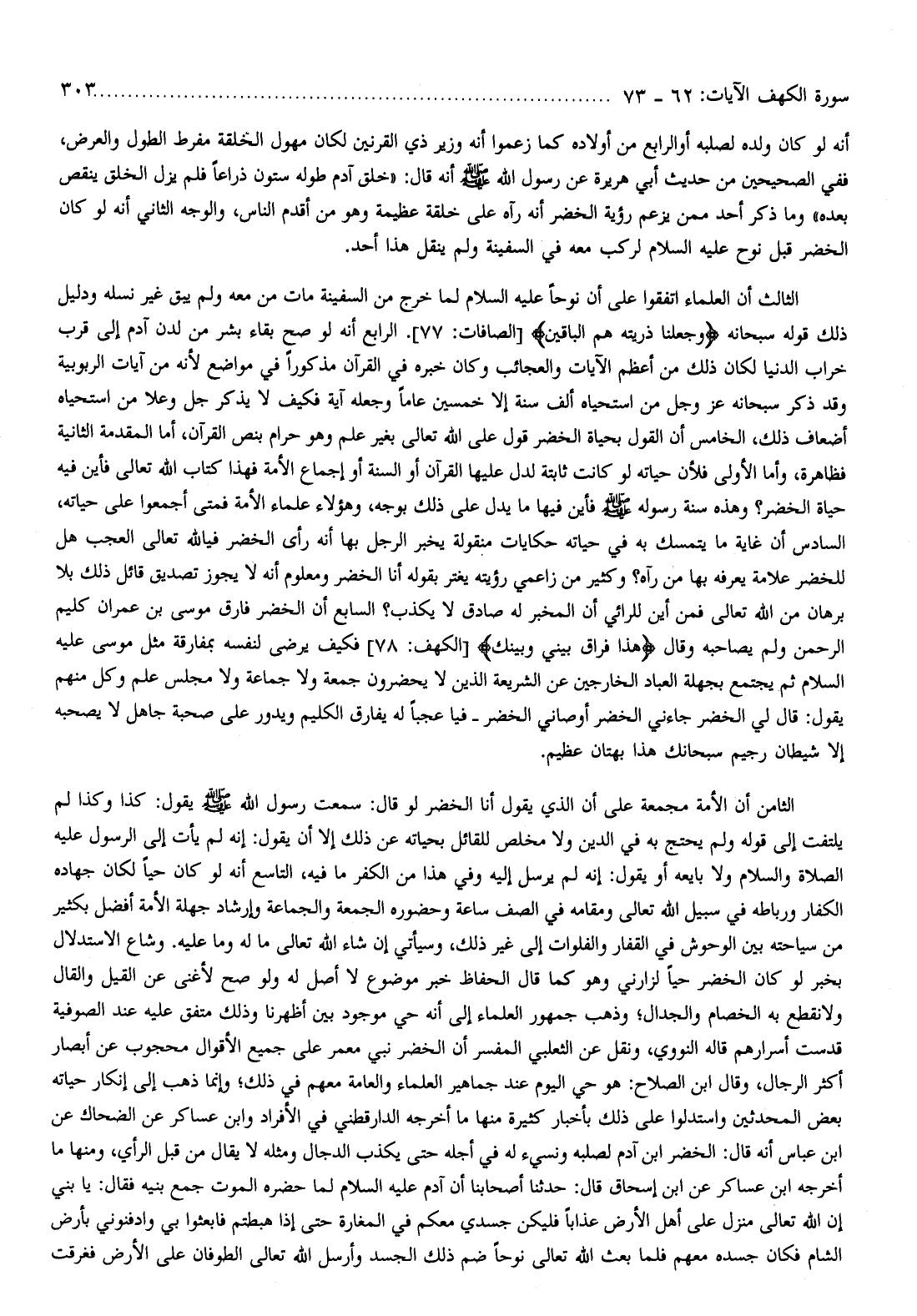 الثامن أن الأمة مجمعة على أن الذي يقول أنا الخضر لو قال: سمعت رسول الله صلّى الله عليه وسلّم يقول: كذا وكذا لم يلتفت إلى قوله ولم يحتج به في الدين ولا مخلص للقائل بحياته عن ذلك إلا أن يقول: إنه لم يأت إلى الرسول عليه الصلاة والسلام ولا بايعه أو يقول: إنه لم يرسل إليه وفي هذا من الكفر ما فيه، التاسع أنه لو كان حيا لكان جهاده الكفار ورباطه في سبيل الله تعالى ومقامه في الصف ساعة وحضوره الجمعة والجماعة وإرشاد جهلة الأمة أفضل بكثير من سياحته بين الوحوش في القفار والفلوات إلى غير ذلك، وسيأتي إن شاء الله تعالى ما له وما عليه. وشاع الاستدلال بخبر لو كان الخضر حيا لزارني وهو كما قال الحفاظ خبر موضوع لا أصل له ولو صح لأغنى عن القيل والقال ولا نقطع به الخصام والجدال وذهب جمهور العلماء إلى أنه حي موجود بين أظهرنا وذلك متفق عليه عند الصوفية قدست أسرارهم قاله النووي، ونقل عن الثعلبي المفسر أن الخضر نبي معمر على جميع الأقوال محجوب عن أبصار أكثر الرجال، وقال ابن الصلاح: هو حي اليوم عند جماهير العلماء والعامة معهم في ذلك وإنما ذهب إلى إنكار حياته بعض المحدثين واستدلوا على ذلك بأخبار كثيرة منها ما أخرجه الدارقطني في الأفراد وابن عساكر عن الضحاك عن ابن عباس أنه قال: الخضر ابن آدم لصلبه ونسيء له في أجله حتى يكذب الدجال ومثله لا يقال من قبل الرأي، ومنها ما