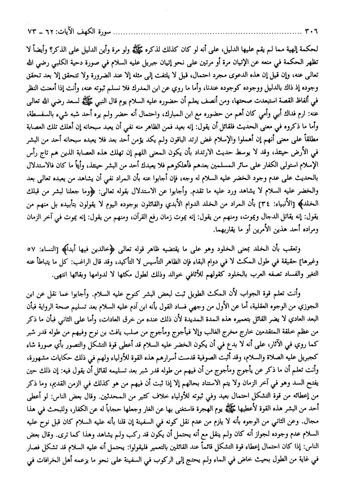 وأنت تعلم قوة الجواب لأن المكث الطويل ثبت لبعض البشر كنوح عليه السلام. وأجابوا عما نقل عن ابن الجوزي من الوجوه العقلية، أما عن الأول من وجهي فساد القول بأنه ابن آدم عليه السلام بعد تسليم صحة الرواية فبأن البعد العادي لا يضر القائل بتعميره هذه المدة المديدة لأن ذلك عنده من خرق العادات، وأما على الثاني فبأن ما ذكر من عظم خلقة المتقدمين خارج مخرج الغالب وإلا فيأجوج ومأجوج من صلب يافث بن نوح وفيهم من طوله قدر شبر كما روي في الآثار، على أنه لا بدع في أن يكون الخضر عليه السلام قد أعطى قوة التشكل والتصور بأي صورة شاء كجبريل عليه الصلاة والسلام، وقد أثبت الصوفية قدست أسرارهم هذه القوة للأولياء ولهم في ذلك حكايات مشهورة، وأنت تعلم أن ما ذكر عن يأجوج ومأجوج من أن فيهم من طوله قدر شبر بعد تسليمه لقائل أن يقول فيه: إن ذلك حين يفتح السد وهو في آخر الزمان ولا يتم الاستناد بحالهم إلا إذا ثبت أن فيهم من هو كذلك في الزمن القديم، وما ذكر من إعطائه من قوة التشكل احتمال بعيد وفي ثبوته للأولياء خلاف كثير من المحدثين. وقال بعض الناس: لو أعطى أحد من البشر هذه القوة لأعطيها صلّى الله عليه وسلّم يوم الهجرة فاستغنى بها عن الغار وجعلها حجابا له عن الكفار، وللبحث في هذا مجال. وعن الثاني من الوجوه بأنه لا يلزم من عدم نقل كونه في السفينة إن قلنا بأنه عليه السلام كان قبل نوح عليه السلام عدم وجوده لجواز أنه كان ولم ينقل مع أنه يحتمل أن يكون قد ركب ولم يشاهد وهذا كما ترى. وقال بعض الناس: إذا كان احتمال إعطاء قوة التشكل قائما عند القائلين بالتعمير فليقولوا: يحتمل أنه عليه السلام قد تشكل فصار في غاية من الطول بحيث خاض في الماء ولم يحتج إلى الركوب في السفينة على نحو ما يزعمه أهل الخرافات في