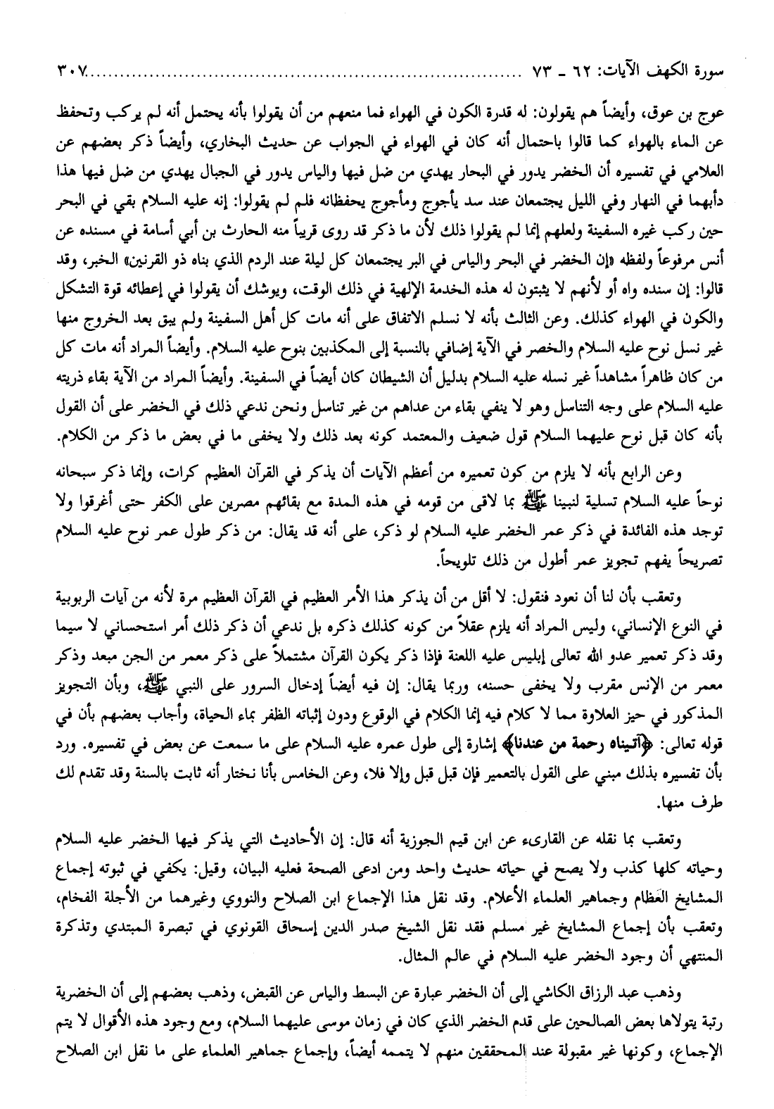 ، وقد قالوا: إن سنده واه أو لأنهم لا يثبتون له هذه الخدمة الإلهية في ذلك الوقت، ويوشك أن يقولوا في إعطائه قوة التشكل والكون في الهواء كذلك. وعن الثالث بأنه لا نسلم الاتفاق على أنه مات كل أهل السفينة ولم يبق بعد الخروج منها غير نسل نوح عليه السلام والخصر في الآية إضافي بالنسبة إلى المكذبين بنوح عليه السلام. وأيضا المراد أنه مات كل من كان ظاهرا مشاهدا غير نسله عليه السلام بدليل أن الشيطان كان أيضا في السفينة. وأيضا المراد من الآية بقاء ذريته عليه السلام على وجه التناسل وهو لا ينفي بقاء من عداهم من غير تناسل ونحن ندعي ذلك في الخضر على أن القول بأنه كان قبل نوح عليهما السلام قول ضعيف والمعتمد كونه بعد ذلك ولا يخفى ما في بعض ما ذكر من الكلام.