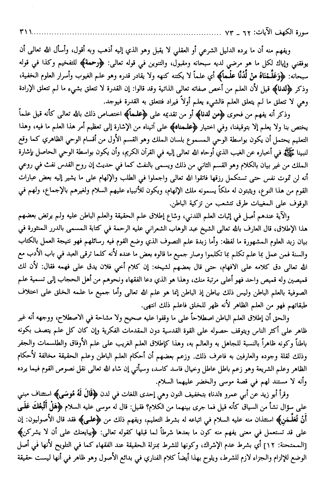والآية عندهم أصل في إثبات العلم اللدني، وشاع إطلاق علم الحقيقة والعلم الباطن عليه ولم يرتض بعضهم هذا الإطلاق، قال العارف بالله تعالى الشيخ عبد الوهاب الشعراني عليه الرحمة في كتابة المسمى بالدرر المنثورة في بيان زبد العلوم المشهورة ما لفظه: وأما زبدة علم التصوف الذي وضع القوم فيه رسائلهم فهو نتيجة العمل بالكتاب والسنة فمن عمل بما علم تكلم بما تكلموا وصار جميع ما قالوه بعض ما عنده لأنه كلما ترقى العبد في باب الأدب مع الله تعالى دق كلامه على الافهام، حتى قال بعضهم لشيخه: إن كلام أخي فلان يدق على فهمه فقال: لأن لك قميصين وله قميص واحد فهو أعلى مرتبة منك، وهذا هو الذي دعا الفقهاء ونحوهم من أهل الحجاب إلى تسمية علم الصوفية بالعلم الباطن وليس ذلك بباطن إذ الباطن إنما هو علم الله تعالى وأما جميع ما علمه الخلق على اختلاف طبقاتهم فهو من العلم الظاهر لأنه ظهر للخلق فاعلم ذلك انتهى.