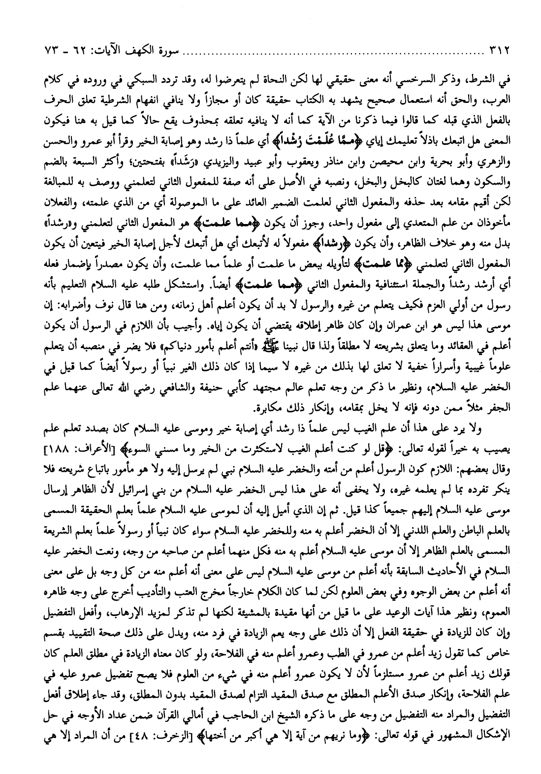 في الشرط، وذكر السرخسي أنه معنى حقيقي لها لكن النحاة لم يتعرضوا له، وقد تردد السبكي في وروده في كلام العرب، والحق أنه استعمال صحيح يشهد به الكتاب حقيقة كان أو مجازا ولا ينافي انفهام الشرطية تعلق الحرف بالفعل الذي قبله كما قالوا فيما ذكرنا من الآية كما أنه لا ينافيه تعلقه بمحذوف يقع حالا كما قيل به هنا فيكون المعنى هل اتبعك باذلا تعليمك إياي مِمَّا عُلِّمْتَ رُشْداً أي علما ذا رشد وهو إصابة الخير وقرأ أبو عمرو والحسن والزهري وأبو بحرية وابن محيصن وابن مناذر ويعقوب وأبو عبيد واليزيدي «رشدا» بفتحتين وأكثر السبعة بالضم والسكون وهما لغتان كالبخل والبخل، ونصبه في الأصل على أنه صفة للمفعول الثاني لتعلمني ووصف به للمبالغة لكن أقيم مقامه بعد حذفه والمفعول الثاني لعلمت الضمير العائد على ما الموصولة أي من الذي علمته، والفعلان مأخوذان من علم المتعدي إلى مفعول واحد، وجوز أن يكون مِمَّا عُلِّمْتَ هو المفعول الثاني لتعلمني و «رشدا» بدل منه وهو خلاف الظاهر، وأن يكون رُشْداً مفعولا له لأتبعك أي هل أتبعك لأجل إصابة الخير فيتعين أن يكون المفعول الثاني لتعلمني مِمَّا عُلِّمْتَ لتأويله ببعض ما علمت أو علما مما علمت، وأن يكون مصدرا بإضمار فعله أي أرشد رشدا والجملة استئنافية والمفعول الثاني مِمَّا عُلِّمْتَ أيضا. واستشكل طلبه عليه السّلام التعليم بأنه رسول من أولي العزم فكيف يتعلم من غيره والرسول لا بد أن يكون أعلم أهل زمانه، ومن هنا قال نوف وأضرابه: إن موسى هذا ليس هو ابن عمران وإن كان ظاهر إطلاقه يقتضي أن يكون إياه. وأجيب بأن اللازم في الرسول أن يكون أعلم في العقائد وما يتعلق بشريعته لا مطلقا ولذا