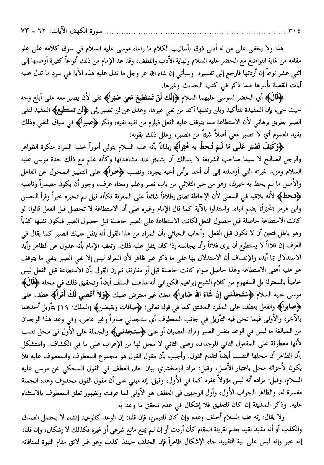 وَكَيْفَ تَصْبِرُ عَلى ما لَمْ تُحِطْ بِهِ خُبْراً إيذانا بأنه عليه السّلام يتولى أمورا خفية المراد منكرة الظواهر والرجل الصالح لا سيما صاحب الشريعة لا يتمالك أن يشمئز عند مشاهدتها وكأنه علم مع ذلك حدة موسى عليه السّلام ومزيد غيرته التي أوصلته إلى أن أخذ برأس أخيه يجره، ونصب خُبْراً على التمييز المحول عن الفاعل والأصل ما لم يحط به خبرك، وهو من خبر الثلاثي من باب نصر وعلم ومعناه عرف، وجوز أن يكون مصدرا وناصبه تُحِطْ لأنه يلاقيه في المعنى لأن الإحاطة تطلق إطلاقا شائعا على المعرفة فكأنه قيل لم تخبره خبرا وقرأ الحسن وابن هرمز «خبرا» بضم الباء. واستدلوا بالآية كما قال الإمام وغيره على أن الاستطاعة لا تحصل قبل الفعل قالوا: لو كانت الاستطاعة حاصلة قبل حصول الفعل لكانت الاستطاعة على الصبر حاصلة قبل حصول الصبر فيكون نفيها كذبا وهو باطل فتعين أن لا تكون قبل الفعل. وأجاب الجبائي بأن المراد من هذا القول أنه يثقل عليك الصبر كما يقال في العرف إن فلانا لا يستطيع أن يرى فلانا وأن يجالسه إذا كان يثقل عليه ذلك. وتعقبه الإمام بأنه عدول عن الظاهر وأيد الاستدلال بما أيد، والإنصاف أن الاستدلال بها على ما ذكر غير ظاهر لأن المراد ليس إلا نفي الصبر بنفي ما يتوقف هو عليه أعني الاستطاعة وهذا حاصل سواء كانت حاصلة قبل أو مقارنة، ثم إن القول بأن الاستطاعة قبل الفعل ليس خاصا بالمعتزلة بل المفهوم من كلام الشيخ إبراهيم الكوراني أنه مذهب السلف أيضا وتحقيق ذلك في محله قالَ موسى عليه السّلام سَتَجِدُنِي إِنْ شاءَ اللَّهُ صابِراً معك غير معترض عليك وَلا أَعْصِي لَكَ أَمْراً عطف على صابِراً والفعل يعطف على المفرد المشتق كما في قوله تعالى: صافَّاتٍ وَيَقْبِضْنَ [الملك: 19] بتأويل أحدهما بالآخر، والأولى فيما نحن فيه التأويل في جانب المعطوف أي ستجدني صابرا وغير عاص، وفي وعد هذا الوجدان من المبالغة ما ليس في الوعد بنفس الصبر وترك العصيان أو على سَتَجِدُنِي والجملة على الأول في محل نصب لأنها معطوفة على المفعول الثاني للوجدان، وعلى الثاني لا محل لها من الإعراب على ما في الكشاف. واستشكل بأن الظاهر أن محلها النصب أيضا لتقدم القول. وأجيب بأن مقول القول هو مجموع المعطوف والمعطوف عليه فلا يكون لأجزائه محل باعتبار الأصل، وقيل: مراد الزمخشري بيان حال العطف في القول المحكي عن موسى عليه السّلام، وقيل: مراده أنه ليس مؤولا بمفرد كما في الأول، وقيل: إنه مبني على أن مقول القول محذوف وهذه الجملة مفسرة له، والظاهر الجواب الأول، وأول الوجهين في العطف هو الأولى لما عرفت ولظهور تعلق المعطوف بالاستثناء عليه. وذكر المشيئة إن كان للتعليق فلا إشكال في عدم تحقق ما وعد به.