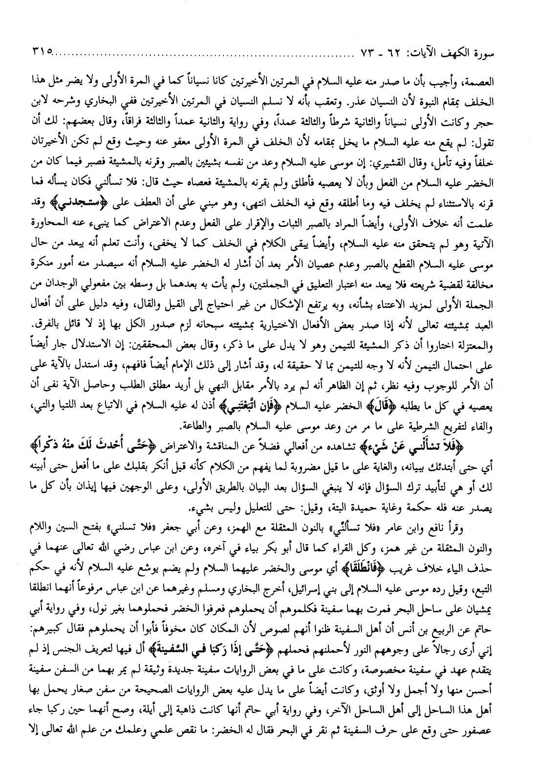 العصمة، وأجيب بأن ما صدر منه عليه السّلام في المرتين الأخيرتين كانا نسيانا كما في المرة الأولى ولا يضر مثل هذا الخلف بمقام النبوة لأن النسيان عذر. وتعقب بأنه لا نسلم النسيان في المرتين الأخيرتين ففي البخاري وشرحه لابن حجر وكانت الأولى نسيانا والثانية شرطا والثالثة عمدا، وفي رواية والثانية عمدا والثالثة فراقا، وقال بعضهم: لك أن تقول: لم يقع منه عليه السّلام ما يخل بمقامه لأن الخلف في المرة الأولى معفو عنه وحيث وقع لم تكن الأخيرتان خلفا وفيه تأمل، وقال القشيري: إن موسى عليه السّلام وعد من نفسه بشيئين بالصبر وقرنه بالمشيئة فصبر فيما كان من الخضر عليه السّلام من الفعل وبأن لا يعصيه فأطلق ولم يقرنه بالمشيئة فعصاه حيث قال: فلا تسألني فكان يسأله فما قرنه بالاستثناء لم يخلف فيه وما أطلقه وقع فيه الخلف انتهى، وهو مبني على أن العطف على سَتَجِدُنِي وقد علمت أنه خلاف الأولى، وأيضا المراد بالصبر الثبات والإقرار على الفعل وعدم الاعتراض كما ينبىء عنه المحاورة الآتية وهو لم يتحقق منه عليه السّلام، وأيضا يبقى الكلام في الخلف كما لا يخفى، وأنت تعلم أنه يبعد من حال موسى عليه السّلام القطع بالصبر وعدم عصيان الأمر بعد أن أشار له الخضر عليه السّلام أنه سيصدر منه أمور منكرة مخالفة لقضية شريعته فلا يبعد منه اعتبار التعليق في الجملتين، ولم يأت به بعدهما بل وسطه بين مفعولي الوجدان من الجملة الأولى لمزيد الاعتناء بشأنه، وبه يرتفع الإشكال من غير احتياج إلى القيل والقال، وفيه دليل على أن أفعال العبد بمشيئته تعالى لأنه إذا صدر بعض الأفعال الاختيارية بمشيئته سبحانه لزم صدور الكل بها إذ لا قائل بالفرق.