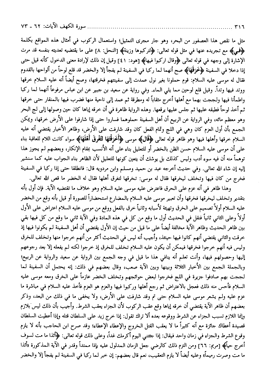 وهذا ظاهر في أنه عزم على الحرق فاعترض عليه موسى عليه السّلام وهو خلاف ما تقتضيه الآية. فإن أول بأنه بتقدير وتخلف ليخرقها فخرقها وأن تعبير موسى عليه السّلام بالمضارع استحضارا للصورة أو قيل بأنه وقع من الخضر عليه السّلام أولا تصميم على الخرق وتهيئة لأسبابه وثانيا خرق بالفعل ووقع من موسى عليه السّلام اعتراض على الأول أولا وعلى الثاني ثانيا فنقل في الحديث أول ما وقع من كل في هذه المادة وفي الآية ثاني ما وقع من كل فيها بقي بين ظاهر الحديث وظاهر الآية مخالفة أيضا على ما قيل من حيث إن الأول يقتضي أن أهل السفينة لم يكونوا فيها إذ خرقت والثاني يقتضي أنهم كانوا فيها حينئذ، وأجيب أنه ليس في الحديث أكثر من أنهم خرجوا منها وتخلف للخرق وليس فيه أنهم خرجوا فخرقها فيمكن أن يكون عليه السّلام تخلف للخرق إذ خرجوا لكنه لم يفعله إلا بعد رجوعهم إليها وحصولهم فيها، وأنت تعلم أنه ينافي هذا ما قيل في وجه الجمع بين الرواية عن سعيد والرواية عن الربيع وبالجملة الجمع بين الأخبار الثلاثة وبينها وبين الآية صعب، وقال بعضهم في ذلك: إنه يحتمل أن السفينة لما لججت بهم صادفوا جزيرة في اللج فخرجوا لبعض حوائجهم وتخلف الخضر عازما على الخرق ومعه موسى عليه السّلام فأحس منه ذلك فعجل بالاعتراض ثم رجع أهلها وركبوا فيها والعزم هو العزم فأخذ عليه السّلام في مباشرة ما عزم عليه ولم يشعر موسى عليه السّلام حتى تم وقد شارفت على الأرض، ولا يخفى ما في ذلك من البعد، وذكر بعضهم أن ظاهر الآية يقتضي أن خرقه إياها وقع عقب الركوب لأن الجزاء يعقب الشرط. وأجيب بأن ذلك ليس بلازم وإنما اللازم تسبب الجزاء عن الشرط ووقوعه بعده ألا تراك تقول: إذا خرج زيد على السلطان قتله وإذا أعطيت السلطان قصيدة أعطاك جائزة مع أنه كثيرا ما لا يعقب القتل الخروج والإعطاء الإعطاء وقد صرح ابن الحاجب بأنه لا يلزم وقوع الشرط والجزاء في زمان واحد فيقال: إذا جئتني اليوم أكرمك غدا، وعلى ذلك قوله تعالى: أَإِذا ما مِتُّ لَسَوْفَ أُخْرَجُ حَيًّا [مريم: 66] ومن التزم ذلك كالرضي جعل الزمان المدلول عليه بإذا ممتدا وقدر في الآية المذكورة «أئذا ما مت وصرت رميما» وعليه أيضا لا يلزم التعقيب، نعم قال بعضهم: إن خبر لما ركبا في السفينة لم يفجأ إلا والخضر
