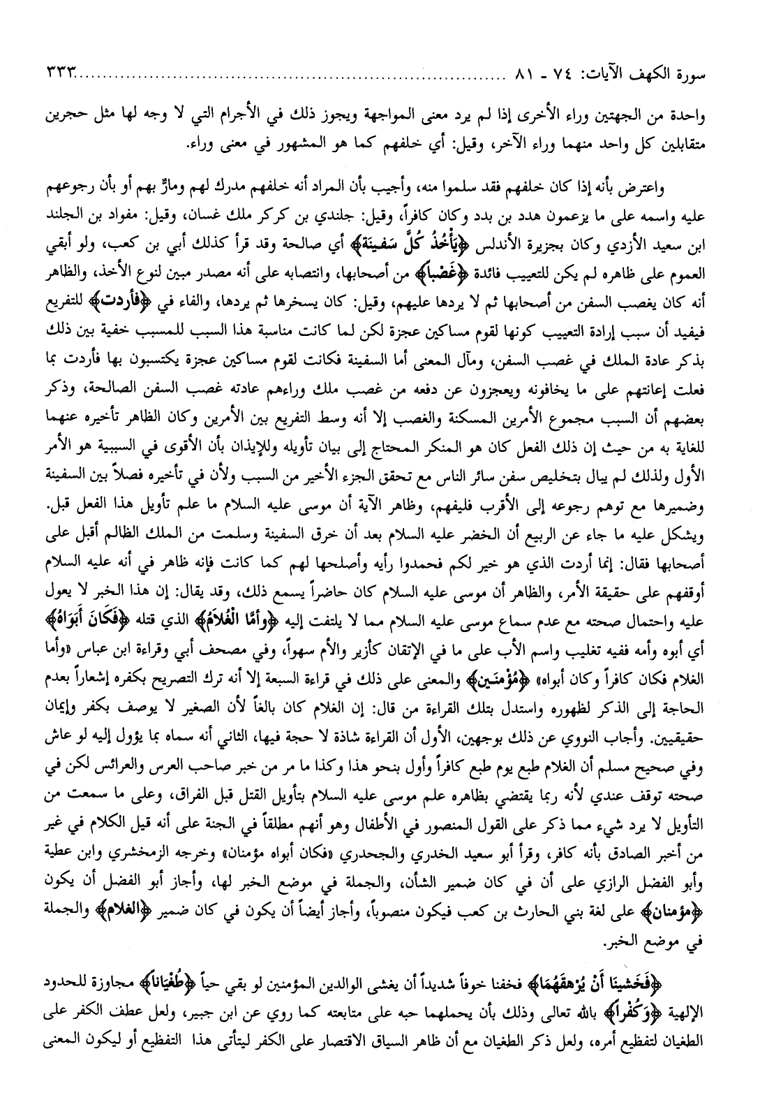 ويشكل عليه ما جاء عن الربيع أن الخضر عليه السّلام بعد أن خرق السفينة وسلمت من الملك الظالم أقبل على أصحابها فقال: إنما أردت الذي هو خير لكم فحمدوا رأيه وأصلحها لهم كما كانت فإنه ظاهر في أنه عليه السّلام أوقفهم على حقيقة الأمر، والظاهر أن موسى عليه السّلام كان حاضرا يسمع ذلك، وقد يقال: إن هذا الخبر لا يعول عليه واحتمال صحته مع عدم سماع موسى عليه السّلام مما لا يلتفت إليه وَأَمَّا الْغُلامُ الذي قتله فَكانَ أَبَواهُ أي أبوه وأمه ففيه تغليب واسم الأب على ما في الإتقان كأزير والأم سهوا، وفي مصحف أبي وقراءة ابن عباس «وأما الغلام فكان كافرا وكان أبواه» مُؤْمِنَيْنِ والمعنى على ذلك في قراءة السبعة إلا أنه ترك التصريح بكفره إشعارا بعدم الحاجة إلى الذكر لظهوره واستدل بتلك القراءة من قال: إن الغلام كان بالغا لأن الصغير لا يوصف بكفر وإيمان حقيقيين. وأجاب النووي عن ذلك بوجهين، الأول أن القراءة شاذة لا حجة فيها، الثاني أنه سماه بما يؤول إليه لو عاش وفي صحيح مسلم أن الغلام طبع يوم طبع كافرا وأول بنحو هذا وكذا ما مر من خبر صاحب العرس والعرائس لكن في صحته توقف عندي لأنه ربما يقتضي بظاهره علم موسى عليه السّلام بتأويل القتل قبل الفراق، وعلى ما سمعت من التأويل لا يرد شيء مما ذكر على القول المنصور في الأطفال وهو أنهم مطلقا في الجنة على أنه قيل الكلام في غير من أخبر الصادق بأنه كافر، وقرأ أبو سعيد الخدري والجحدري «فكان أبواه مؤمنان» وخرجه الزمخشري وابن عطية وأبو الفضل الرازي على أن في كان ضمير الشأن، والجملة في موضع الخبر لها، وأجاز أبو الفضل أن يكون مؤمنان على لغة بني الحارث بن كعب فيكون منصوبا، وأجاز أيضا أن يكون في كان ضمير الْغُلامُ والجملة في موضع الخبر.