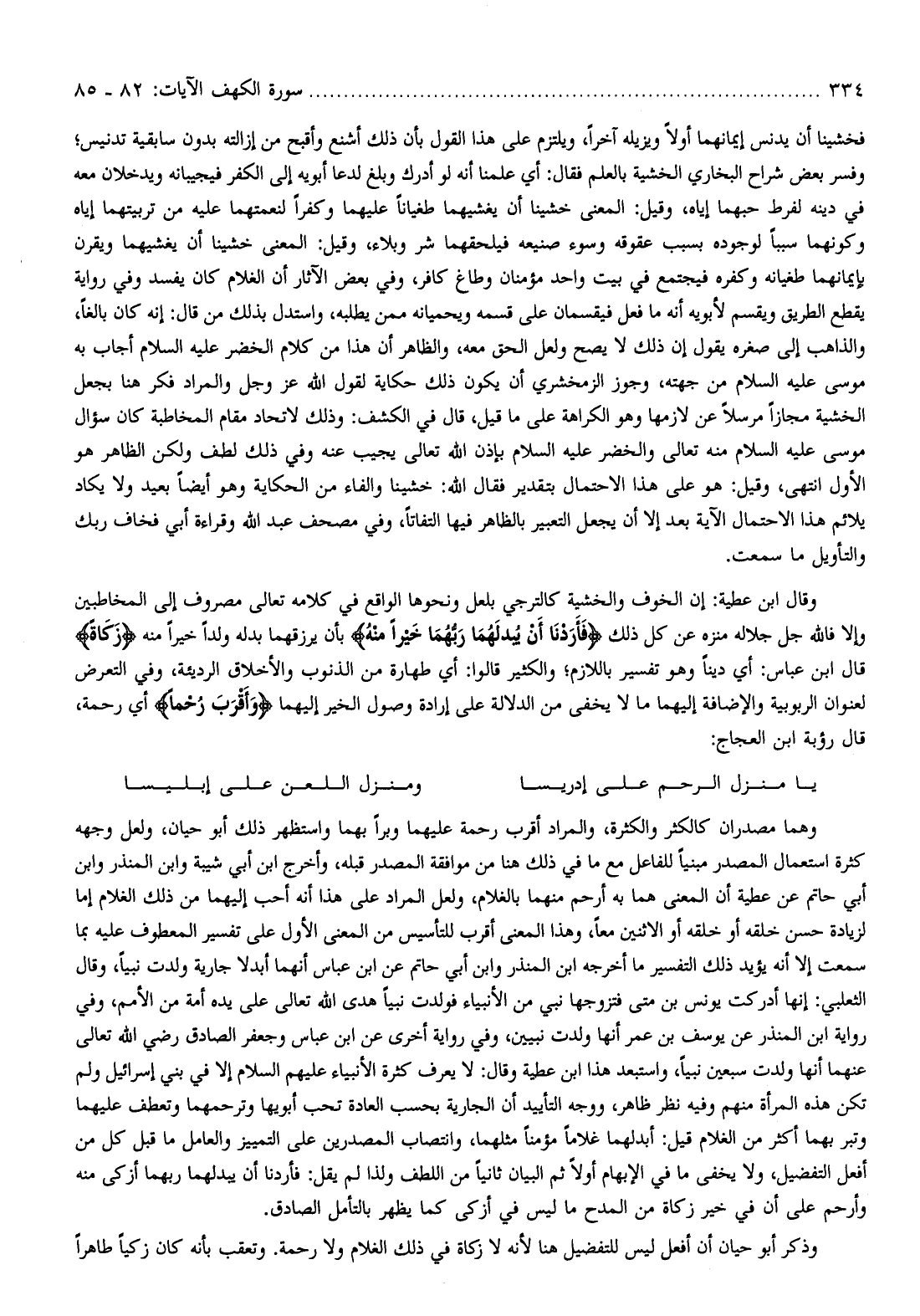 وقال ابن عطية: إن الخوف والخشية كالترجي بلعل ونحوها الواقع في كلامه تعالى مصروف إلى المخاطبين وإلا فالله جل جلاله منزه عن كل ذلك فَأَرَدْنا أَنْ يُبْدِلَهُما رَبُّهُما خَيْراً مِنْهُ بأن يرزقهما بدله ولدا خيرا منه زَكاةً قال ابن عباس: أي دينا وهو تفسير باللازم والكثير قالوا: أي طهارة من الذنوب والأخلاق الرديئة، وفي التعرض لعنوان الربوبية والإضافة إليهما ما لا يخفى من الدلالة على إرادة وصول الخير إليهما وَأَقْرَبَ رُحْماً أي رحمة، قال رؤبة ابن العجاج: