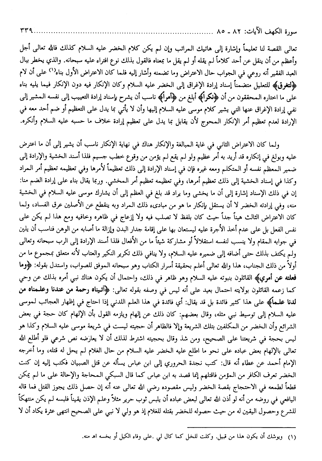 إن في ذلك الإسناد إشارة إلى أن ما يخشى وما يراد قد بلغ في العظم إلى أن يشارك موسى عليه السّلام في الخشية منه، وفي إرادته الخضر لا أن يستقل بإنكار ما هو من مبادئ ذلك المراد وبه ينقطع عن الأصلين عرق الفساد، ولما كان الاعتراض الثالث هينا جدا حيث كان بلفظ لا تصلب فيه ولا إزعاج في ظاهره وخافيه ومع هذا لم يكن على نفس الفعل بل على عدم أخذ الأجرة عليه ليستعان بها على إقامة جدار البدن وإزالة ما أصابه من الوهن فناسب أن يلين في جوابه المقام ولا ينسب لنفسه استقلالا أو مشاركة شيئا ما من الأفعال فلذا أسند الإرادة إلى الرب سبحانه وتعالى ولم يكتف بذلك حتى أضافه إلى ضميره عليه السّلام، ولا ينافي ذلك تكرير النكير والعتاب لأنه متعلق بمجموع ما من أولا من ذلك الجناب، هذا والله تعالى أعلم بحقيقة أسرار الكتاب وهو سبحانه الموفق للصواب، واستدل بقوله: وَما فَعَلْتُهُ عَنْ أَمْرِي القائلون بنبوته عليه السّلام وهو ظاهر في ذلك، واحتمال أن يكون هناك نبي أمره بذلك عن وحي كما زعمه القائلون بولايته احتمال بعيد على أنه ليس في وصفه بقوله تعالى: آتَيْناهُ رَحْمَةً مِنْ عِنْدِنا وَعَلَّمْناهُ مِنْ لَدُنَّا عِلْماً على هذا كثير فائدة بل قد يقال: أي فائدة في هذا العلم اللدني إذا احتاج في إظهار العجائب لموسى عليه السّلام إلى توسيط نبي مثله، وقال بعضهم: كان ذلك عن إلهام ويلزمه القول بأن الإلهام كان حجة في بعض الشرائع وأن الخضر من المكلفين بتلك الشريعة وإلا فالظاهر أن حجيته ليست في شريعة موسى عليه السّلام وكذا هو ليس بحجة في شريعتنا على الصحيح، ومن شذ وقال بحجيته اشترط لذلك أن لا يعارضه نص شرعي فلو أطلع الله تعالى بالإلهام بعض عباده على نحو ما اطلع عليه الخضر عليه السّلام من حال الغلام لم يحل له قتله، وما أخرجه الإمام أحمد عن عطاء أنه قال: كتب نجدة الحروري إلى ابن عباس يسأله عن قتل الصبيان فكتب إليه إن كنت الخضر تعرف الكافر من المؤمن فاقتلهم إنما قصد به ابن عباس كما قال السبكي المحاجة والإحالة على ما لم يمكن قطعا لطمعه في الاحتجاج بقصة الخضر وليس مقصوده رضي الله تعالى عنه أنه إن حصل ذلك يجوز القتل فما قاله اليافعي في روضه من أنه لو أذن الله تعالى لبعض عباده أن يلبس ثوب حرير مثلا وعلم الإذن يقينا فلبسه لم يكن منتهكا للشرع وحصول اليقين له من حيث حصوله للخضر بقتله للغلام إذ هو ولي لا نبي على الصحيح انتهى عثرة يكاد أن لا