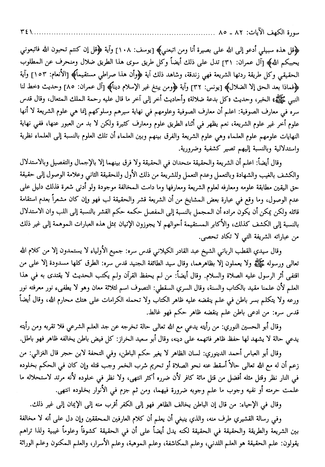 وقال سيدي القطب الرباني الشيخ عبد القادر الكيلاني قدس سره: جميع الأولياء لا يستمدون إلا من كلام الله تعالى ورسوله صلّى الله عليه وسلّم ولا يعملون إلا بظاهرهما، وقال سيد الطائفة الجنيد قدس سره: الطرق كلها مسدودة إلا على من اقتفى أثر الرسول عليه الصلاة والسّلام. وقال أيضا: من لم يحفظ القرآن ولم يكتب الحديث لا يقتدى به في هذا العلم لأن علمنا مقيد بالكتاب والسنة، وقال السري السقطي: التصوف اسم لثلاثة معان وهو لا يطفىء نور معرفته نور ورعه ولا يتكلم بسر باطن في علم ينقضه عليه ظاهر الكتاب ولا تحمله الكرامات على هتك محارم الله، وقال أيضا قدس سره: من ادعى باطن علم ينقضه ظاهر حكم فهو غالط.