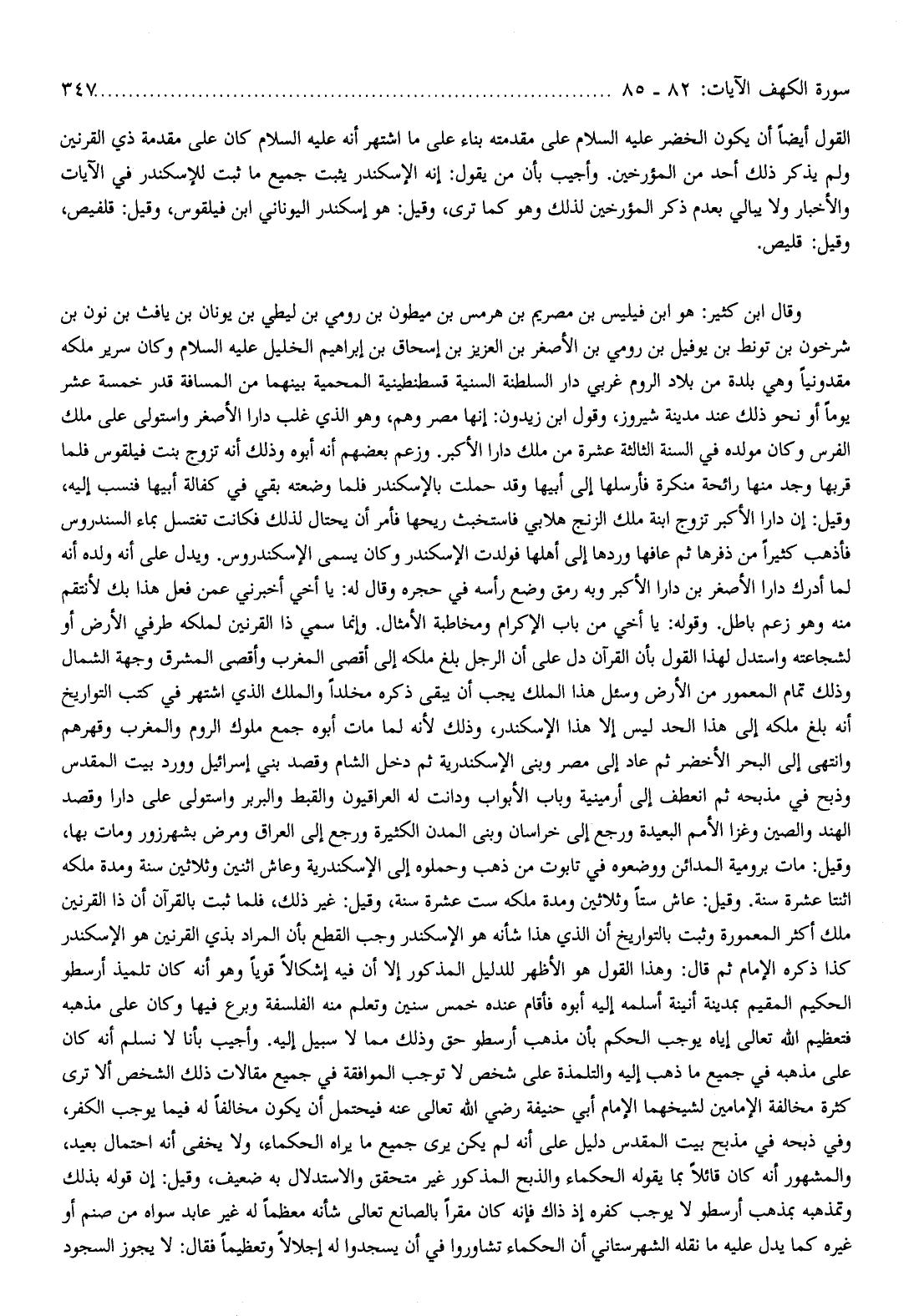 وقال ابن كثير: هو ابن فيليس بن مصريم بن هرمس بن ميطون بن رومي بن ليطي بن يونان بن يافث بن نون بن شرخون بن تونط بن يوفيل بن رومي بن الأصغر بن العزيز بن إسحاق بن إبراهيم الخليل عليه السّلام وكان سرير ملكه مقدونيا وهي بلدة من بلاد الروم غربي دار السلطنة السنية قسطنطينية المحمية بينهما من المسافة قدر خمسة عشر يوما أو نحو ذلك عند مدينة شيروز، وقول ابن زيدون: إنها مصر وهم، وهو الذي غلب دارا الأصغر واستولى على ملك الفرس وكان مولده في السنة الثالثة عشرة من ملك دارا الأكبر. وزعم بعضهم أنه أبوه وذلك أنه تزوج بنت فيلقوس فلما قربها وجد منها رائحة منكرة فأرسلها إلى أبيها وقد حملت بالإسكندر فلما وضعته بقي في كفالة أبيها فنسب إليه، وقيل: إن دارا الأكبر تزوج ابنة ملك الزنج هلابي فاستخبث ريحها فأمر أن يحتال لذلك فكانت تغتسل بماء السندروس فأذهب كثيرا من ذفرها ثم عافها وردها إلى أهلها فولدت الإسكندر وكان يسمى الإسكندروس. ويدل على أنه ولده أنه لما أدرك دارا الأصغر بن دارا الأكبر وبه رمق وضع رأسه في حجره وقال له: يا أخي أخبرني عمن فعل هذا بك لأنتقم منه وهو زعم باطل. وقوله: يا أخي من باب الإكرام ومخاطبة الأمثال. وإنما سمي ذا القرنين لملكه طرفي الأرض أو لشجاعته واستدل لهذا القول بأن القرآن دل على أن الرجل بلغ ملكه إلى أقصى المغرب وأقصى المشرق وجهة الشمال وذلك تمام المعمور من الأرض وسئل هذا الملك يجب أن يبقى ذكره مخلدا والملك الذي اشتهر في كتب التواريخ أنه بلغ ملكه إلى هذا الحد ليس إلا هذا الإسكندر، وذلك لأنه لما مات أبوه جمع ملوك الروم والمغرب وقهرهم وانتهى إلى البحر الأخضر ثم عاد إلى مصر وبني الإسكندرية ثم دخل الشام وقصد بني إسرائيل وورد بيت المقدس وذبح في مذبحه ثم انعطف إلى أرمينية وباب الأبواب ودانت له العراقيون والقبط والبربر واستولى على دارا وقصد الهند والصين وغزا الأمم البعيدة ورجع إلى خراسان وبنى المدن الكثيرة ورجع إلى العراق ومرض بشهرزور ومات بها، وقيل: مات برومية المدائن ووضعوه في تابوت من ذهب وحملوه إلى الإسكندرية وعاش اثنين وثلاثين سنة ومدة ملكه اثنتا عشرة سنة. وقيل: عاش ستا وثلاثين ومدة ملكه ست عشرة سنة، وقيل: غير ذلك، فلما ثبت بالقرآن أن ذا القرنين ملك أكثر المعمورة وثبت بالتواريخ أن الذي هذا شأنه هو الإسكندر وجب القطع بأن المراد بذي القرنين هو الإسكندر كذا ذكره الإمام ثم قال: وهذا القول هو الأظهر للدليل المذكور إلا أن فيه إشكالا قويا وهو أنه كان تلميذ أرسطو الحكيم المقيم بمدينة أنينة أسلمه إليه أبوه فأقام عنده خمس سنين وتعلم منه الفلسفة وبرع فيها وكان على مذهبه فتعظيم الله تعالى إياه يوجب الحكم بأن مذهب أرسطو حق وذلك مما لا سبيل إليه. وأجيب بأنا لا نسلم أنه كان على مذهبه في جميع ما ذهب إليه والتلمذه على شخص لا توجب الموافقة في جميع مقالات ذلك الشخص ألا ترى كثرة مخالفة الإمامين لشيخهما الإمام أبي حنيفة رضي الله تعالى عنه فيحتمل أن يكون مخالفا له فيما يوجب الكفر، وفي ذبحه في مذبح بيت المقدس دليل على أنه لم يكن يرى جميع ما يراه الحكماء، ولا يخفى أنه احتمال بعيد، والمشهور أنه كان قائلا بما يقوله الحكماء والذبح المذكور غير متحقق والاستدلال به ضعيف، وقيل: إن قوله بذلك وتمذهبه بمذهب أرسطو لا يوجب كفره إذ ذاك فإنه كان مقرا بالصانع تعالى شأنه معظما له غير عابد سواه من صنم أو غيره كما يدل عليه ما نقله الشهرستاني أن الحكماء تشاوروا في أن يسجدوا له إجلالا وتعظيما فقال: لا يجوز السجود
