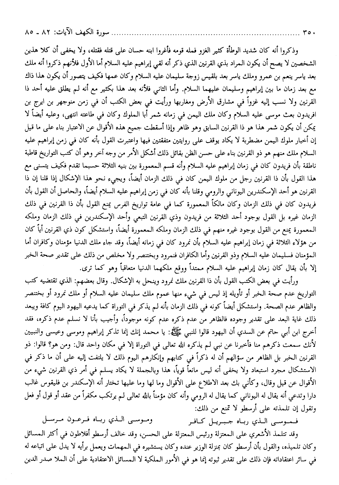 وذكروا أنه كان شديد الوطأة كثير الغزو فمله قومه فأغروا ابنه حسان على قتله فقتله، ولا يخفى أن كلا هذين الشخصين لا يصح أن يكون المراد بذي القرنين الذي ذكر أنه لقي إبراهيم عليه السّلام أما الأول فلأنهم ذكروا أنه ملك بعد ياسر ينعم بن عمرو وملك ياسر بعد بلقيس زوجة سليمان عليه السّلام وكان عمها فكيف يتصور أن يكون هذا ذاك مع بعد زمان ما بين إبراهيم وسليمان عليهما السّلام. وأما الثاني فلأنه بعد هذا بكثير مع أنه لم يطلق عليه أحد ذا القرنين ولا نسب إليه غزوا في مشارق الأرض ومغاربها ورأيت في بعض الكتب أن في زمن منوجهر بن ايرج بن أفريدون بعث موسى عليه السّلام وكان ملك اليمن في زمانه شمر أبا الملوك وكان في طاعته انتهى، وعليه أيضا لا يمكن أن يكون شمر هذا هو ذا القرنين السابق وهو ظاهر وإذا أسقطت جميع هذه الأقوال عن الاعتبار بناء على ما قيل إن أخبار ملوك اليمن مضطربة لا يكاد يوقف على روايتين متفقين فيها واعتبرت القول بأنه كان في زمن إبراهيم عليه السّلام ملك منهم هو ذو القرنين بناء على حسن الظن بقائل ذلك أشكل الأمر من وجه آخر وهو أن كتب التواريخ قاطبة ناطقة بأن فريدون كان في زمان إبراهيم عليه السّلام وأنه قسم المعمورة بين بنيه الثلاثة حسبما تقدم فكيف يتسنى مع هذا القول بأن ذا القرنين رجل من ملوك اليمن كان في ذلك الزمان أيضا، ويجيء نحو هذا الإشكال إذا قلنا إن ذا القرنين هو أحد الإسكندرين اليوناني والرومي وقلنا بأنه كان في زمن إبراهيم عليه السّلام أيضا، والحاصل أن القول بأن فريدون كان في ذلك الزمان وكان مالكا المعمورة كما في عامة تواريخ الفرس يمنع القول بأن ذا القرنين في ذلك الزمان غيره بل القول بوجود أحد الثلاثة من فريدون وذي القرنين التبعي وأحد الإسكندرين في ذلك الزمان وملكه المعمورة يمنع من القول بوجود غيره منهم في ذلك الزمان وملكه المعمورة أيضا، واستشكل كون ذي القرنين أيا كان من هؤلاء الثلاثة في زمان إبراهيم عليه السّلام بأن نمرود كان في زمانه أيضا، وقد جاء ملك الدنيا مؤمنان وكافران أما المؤمنان فسليمان عليه السّلام وذو القرنين وأما الكافران فنمرود وبختنصر ولا مخلص من ذلك على تقدير صحة الخبر إلا بأن يقال كان زمان إبراهيم عليه السّلام ممتدا ووقع ملكهما الدنيا متعاقبا وهو كما ترى.