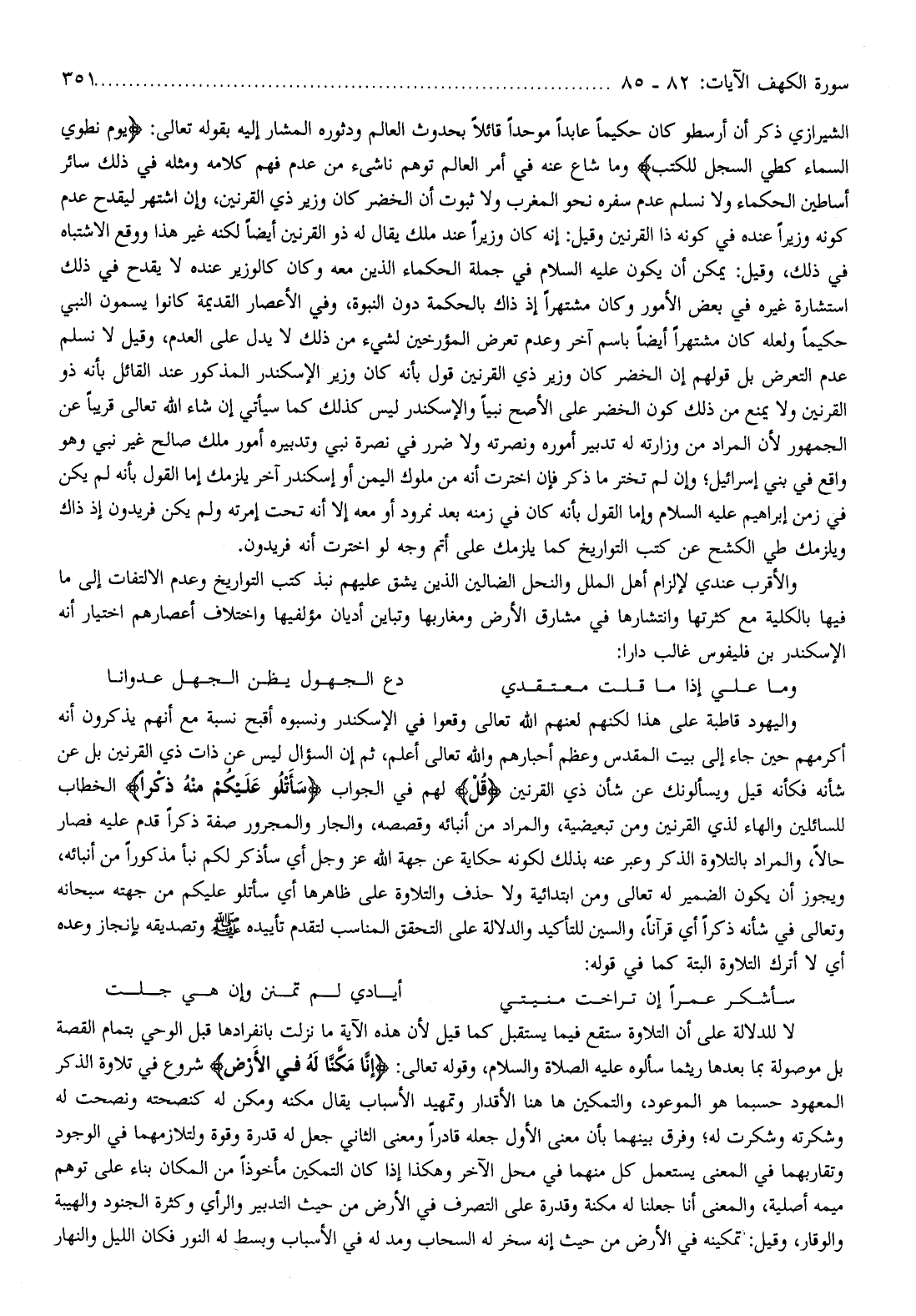 الشيرازي ذكر أن أرسطو كان حكيما عابدا موحدا قائلا بحدوث العالم ودثوره المشار إليه بقوله تعالى: يَوْمَ نَطْوِي السَّماءَ كَطَيِّ السِّجِلِّ لِلْكُتُبِ وما شاع عنه في أمر العالم توهم ناشىء من عدم فهم كلامه ومثله في ذلك سائر أساطين الحكماء ولا نسلم عدم سفره نحو المغرب ولا ثبوت أن الخضر كان وزير ذي القرنين، وإن اشتهر ليقدح عدم كونه وزيرا عنده في كونه ذا القرنين وقيل: إنه كان وزيرا عند ملك يقال له ذو القرنين أيضا لكنه غير هذا ووقع الاشتباه في ذلك، وقيل: يمكن أن يكون عليه السّلام في جملة الحكماء الذين معه وكان كالوزير عنده لا يقدح في ذلك استشارة غيره في بعض الأمور وكان مشتهرا إذ ذاك بالحكمة دون النبوة، وفي الأعصار القديمة كانوا يسمون النبي حكيما ولعله كان مشتهرا أيضا باسم آخر وعدم تعرض المؤرخين لشيء من ذلك لا يدل على العدم، وقيل لا نسلم عدم التعرض بل قولهم إن الخضر كان وزير ذي القرنين قول بأنه كان وزير الإسكندر المذكور عند القائل بأنه ذو القرنين ولا يمنع من ذلك كون الخضر على الأصح نبيا والإسكندر ليس كذلك كما سيأتي إن شاء الله تعالى قريبا عن الجمهور لأن المراد من وزارته له تدبير أموره ونصرته ولا ضرر في نصرة نبي وتدبيره أمور ملك صالح غير نبي وهو واقع في بني إسرائيل وإن لم تختر ما ذكر فإن اخترت أنه من ملوك اليمن أو إسكندر آخر يلزمك إما القول بأنه لم يكن في زمن إبراهيم عليه السّلام وإما القول بأنه كان في زمنه بعد نمرود أو معه إلا أنه تحت إمرته ولم يكن فريدون إذ ذاك ويلزمك طي الكشح عن كتب التواريخ كما يلزمك على أتم وجه لو اخترت أنه فريدون.