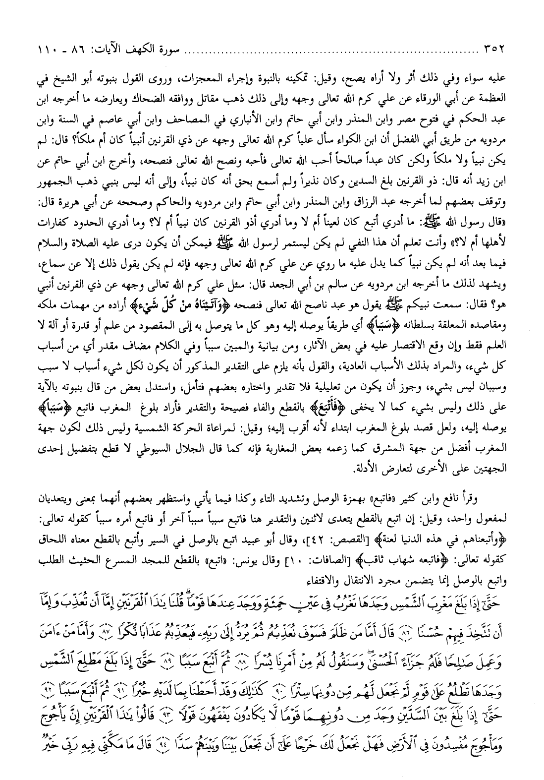 ، وأخرج ابن أبي حاتم عن ابن زيد أنه قال: ذو القرنين بلغ السدين وكان نذيرا ولم أسمع بحق أنه كان نبيا، وإلى أنه ليس بنبي ذهب الجمهور وتوقف بعضهم لما