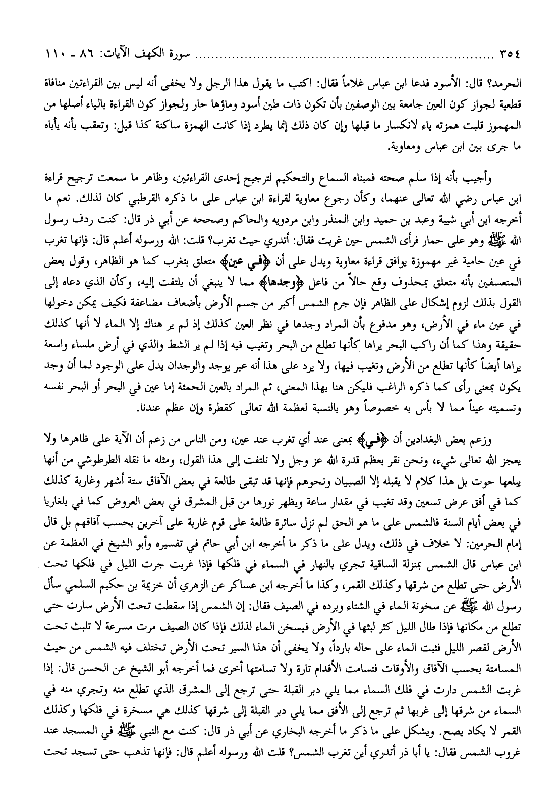 الحرمد؟ قال: الأسود فدعا ابن عباس غلاما فقال: اكتب ما يقول هذا الرجل ولا يخفى أنه ليس بين القراءتين منافاة قطعية لجواز كون العين جامعة بين الوصفين بأن تكون ذات طين أسود وماؤها حار ولجواز كون القراءة بالياء أصلها من المهموز قلبت همزته ياء لانكسار ما قبلها وإن كان ذلك إنما يطرد إذا كانت الهمزة ساكنة كذا قيل: وتعقب بأنه يأباه ما جرى بين ابن عباس ومعاوية.