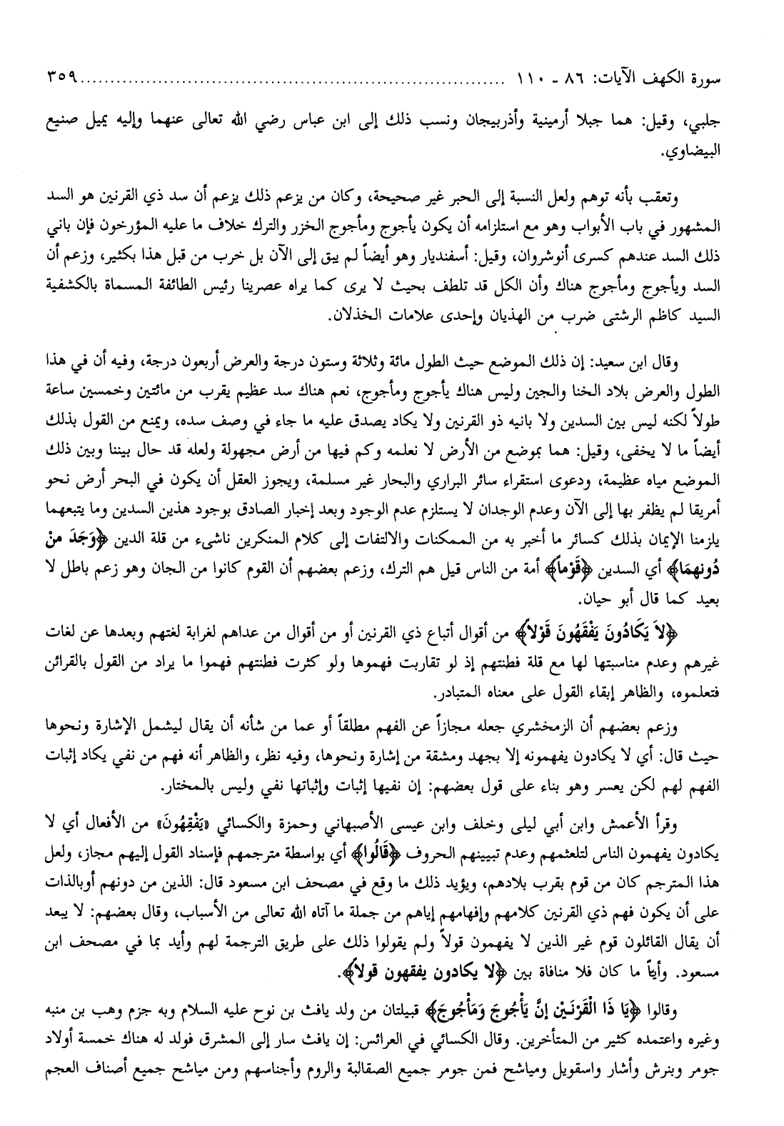 وقرأ الأعمش وابن أبي ليلى وخلف وابن عيسى الأصبهاني وحمزة والكسائي «يفقهون» من الأفعال أي لا يكادون يفهمون الناس لتلعثمهم وعدم تبيينهم الحروف قالُوا أي بواسطة مترجمهم مترجمهم فإسناد القول إليهم مجاز، ولعل هذا المترجم كان من قوم بقرب بلادهم، ويؤيد ذلك ما وقع في مصحف ابن مسعود قال: الذين من دونهم أو بالذات على أن يكون فهم ذي القرنين كلامهم وإفهامهم إياهم من جملة ما آتاه الله تعالى من الأسباب، وقال بعضهم: لا يبعد أن يقال القائلون قوم غير الذين لا يفهمون قولا ولم يقولوا ذلك على طريق الترجمة لهم وأيد بما في مصحف ابن مسعود. وأيّا ما كان فلا منافاة بين لا يَكادُونَ يَفْقَهُونَ قَوْلًا.