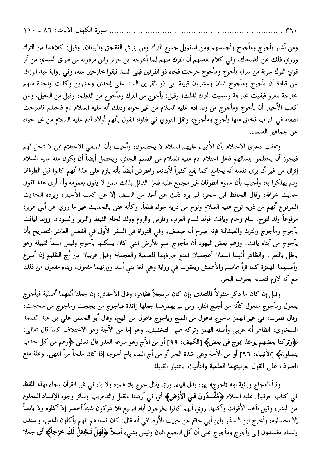 وَتَرَكْنا بَعْضَهُمْ يَوْمَئِذٍ يَمُوجُ فِي بَعْضٍ [الكهف: 99] أو من الأج وهو سرعة العدو قال تعالى وَهُمْ مِنْ كُلِّ حَدَبٍ يَنْسِلُونَ [الأنبياء: 96] أو من الأجة وهي شدة الحر أو من أج الماء ياج أجوجا إذا كان ملحا مرا انتهى. وعلة منع الصرف على القول بعربيتهما العلمية والتأنيث باعتبار القبيلة.