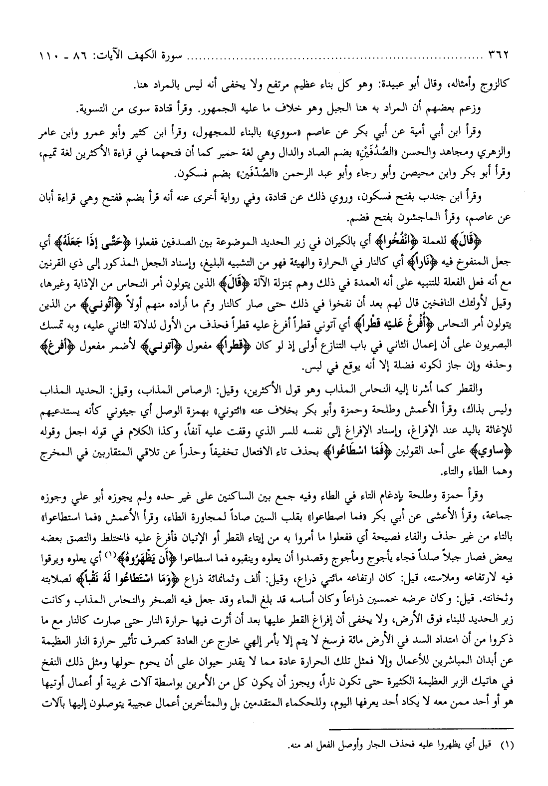 والقطر كما أشرنا إليه النحاس المذاب وهو قول الأكثرين، وقيل: الرصاص المذاب، وقيل: الحديد المذاب وليس بذاك، وقرأ الأعمش وطلحة وحمزة وأبو بكر بخلاف عنه «ائتوني» بهمزة الوصل أي جيئوني كأنه يستدعيهم للإغاثة باليد عند الإفراغ، وإسناد الإفراغ إلى نفسه للسر الذي وقفت عليه آنفا، وكذا الكلام في قوله اجعل وقوله ساوى على أحد القولين فَمَا اسْطاعُوا بحذف تاء الافتعال تخفيفا وحذرا عن تلاقي المتقاربين في المخرج وهما الطاء والتاء.