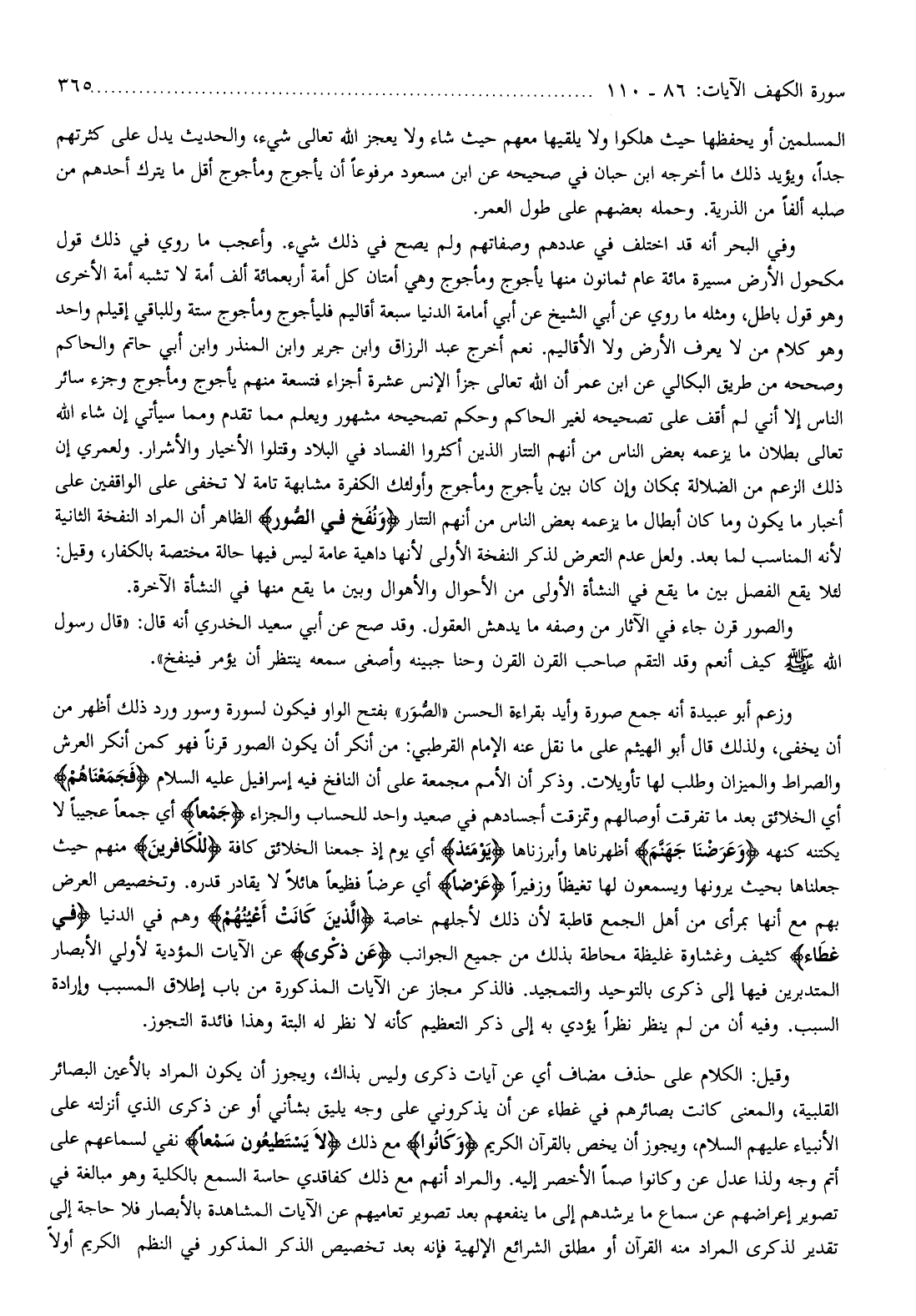 وفي البحر أنه قد اختلف في عددهم وصفاتهم ولم يصح في ذلك شيء. وأعجب ما روي في ذلك قول مكحول الأرض مسيرة مائة عام ثمانون منها يأجوج ومأجوج وهي أمتان كل أمة أربعمائة ألف أمة لا تشبه أمة الأخرى وهو قول باطل، ومثله ما روي عن أبي الشيخ عن أبي أمامة الدنيا سبعة أقاليم فليأجوج ومأجوج ستة وللباقي إقليم واحد وهو كلام من لا يعرف الأرض ولا الأقاليم. نعم أخرج عبد الرزاق وابن جرير وابن المنذر وابن أبي حاتم والحاكم وصححه من طريق البكالي عن ابن عمر أن الله تعالى جزأ الإنس عشرة أجزاء فتسعة منهم يأجوج ومأجوج وجزء سائر الناس إلا أني لم أقف على تصحيحه لغير الحاكم وحكم تصحيحه مشهور ويعلم مما تقدم ومما سيأتي إن شاء الله تعالى بطلان ما يزعمه بعض الناس من أنهم التتار الذين أكثروا الفساد في البلاد وقتلوا الأخيار والأشرار. ولعمري إن ذلك الزعم من الضلالة بمكان وإن كان بين يأجوج ومأجوج وأولئك الكفرة مشابهة تامة لا تخفى على الواقفين على أخبار ما يكون وما كان أبطال ما يزعمه بعض الناس من أنهم التتار وَنُفِخَ فِي الصُّورِ الظاهر أن المراد النفخة الثانية لأنه المناسب لما بعد. ولعل عدم التعرض لذكر النفخة الأولى لأنها داهية عامة ليس فيها حالة مختصة بالكفار، وقيل: