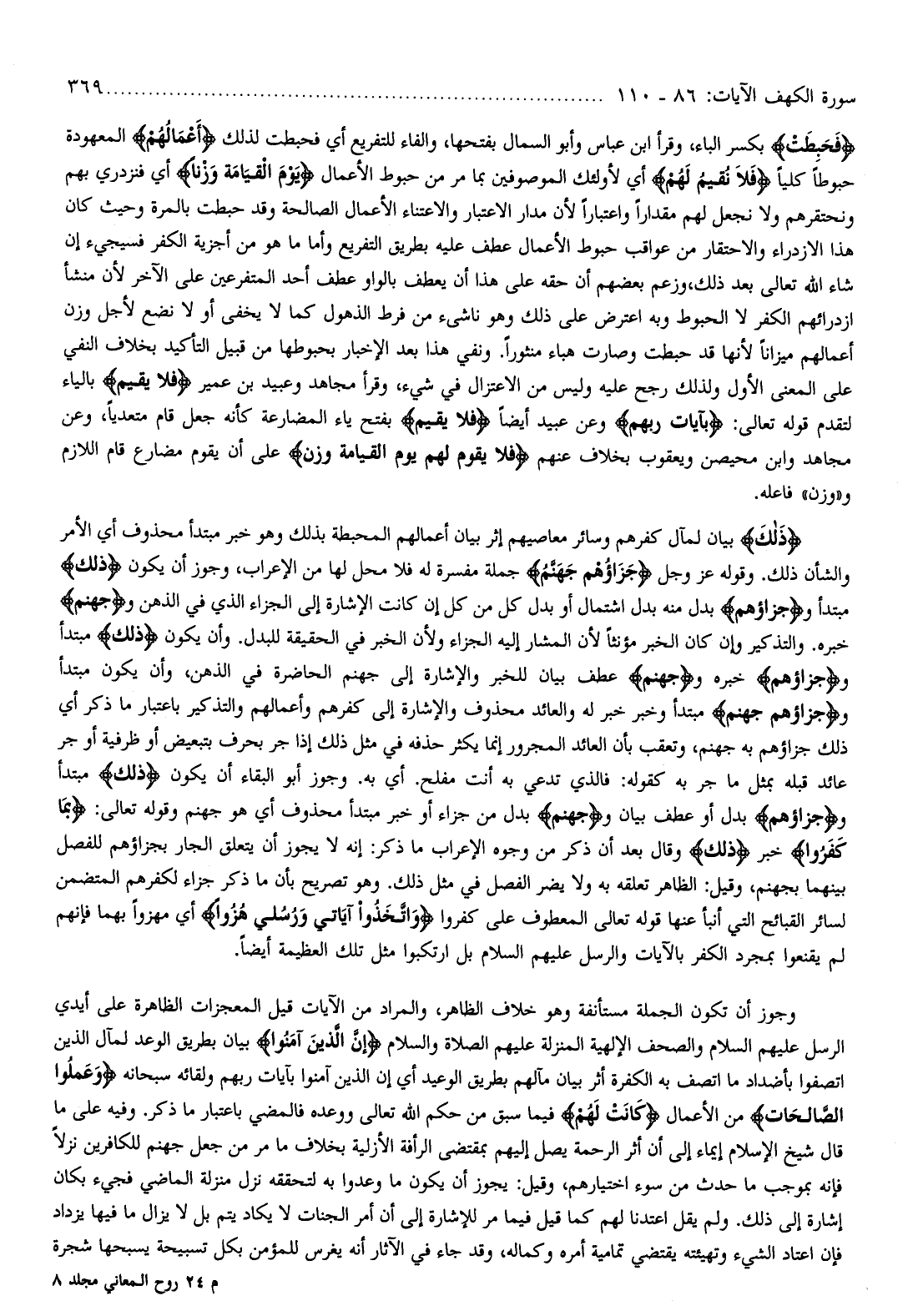 فَحَبِطَتْ بكسر الباء، وقرأ ابن عباس وأبو السمال بفتحها، والفاء للتفريع أي فحبطت لذلك أَعْمالُهُمْ المعهودة حبوطا كليا فَلا نُقِيمُ لَهُمْ أي لأولئك الموصوفين بما مر من حبوط الأعمال يَوْمَ الْقِيامَةِ وَزْناً أي فنزدري بهم ونحتقرهم ولا نجعل لهم مقدارا واعتبارا لأن مدار الاعتبار والاعتناء الأعمال الصالحة وقد حبطت بالمرة وحيث كان هذا الازدراء والاحتقار من عواقب حبوط الأعمال عطف عليه بطريق التفريع وأما ما هو من أجزية الكفر فسيجيء إن شاء الله تعالى بعد ذلك، وزعم بعضهم أن حقه على هذا أن يعطف بالواو عطف أحد المتفرعين على الآخر لأن منشأ ازدرائهم الكفر لا الحبوط وبه اعترض على ذلك وهو ناشىء من فرط الذهول كما لا يخفى أو لا نضع لأجل وزن أعمالهم ميزانا لأنها قد حبطت وصارت هباء منثورا. ونفي هذا بعد الإخبار بحبوطها من قبيل التأكيد بخلاف النفي على المعنى الأول ولذلك رجح عليه وليس من الاعتزال في شيء، وقرأ مجاهد وعبيد بن عمير فلا يقيم بالياء لتقدم قوله تعالى: بِآياتِ رَبِّهِمْ وعن عبيد أيضا فلا يقيم بفتح ياء المضارعة كأنه جعل قام متعديا، وعن مجاهد وابن محيصن ويعقوب بخلاف عنهم فلا يقوم لهم يوم القيامة وزن على أن يقوم مضارع قام اللازم و «وزن» فاعله.