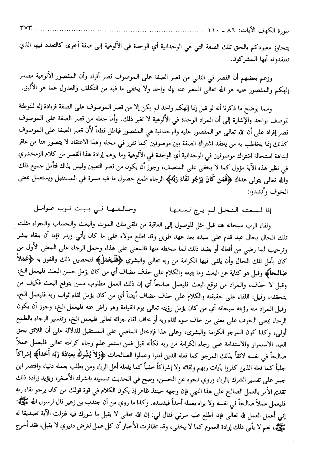 ولقاء الرب سبحانه هنا قيل مثل للوصول إلى العاقبة من تلقى ملك الموت والبعث والحساب والجزاء مثلت تلك الحال بحال عبد قدم على سيده بعد عهد طويل وقد اطلع مولاه على ما كان يأتي ويذر فإما أن يلقاه ببشر وترحيب لما رضي من أفعاله أو بضد ذلك لما سخطه منها فالمعنى على هذا، وحمل الرجاء على المعنى الأول من كان يأمل تلك الحال وأن يلقى فيها الكرامة من ربه تعالى والبشري فَلْيَعْمَلْ لتحصيل ذلك والفوز به عَمَلًا صالِحاً وقيل هو كناية عن البعث وما يتبعه والكلام على حذف مضاف أي من كان يؤمل حسن البعث فليعمل إلخ، وقيل لا حذف، والمراد من توقع البعث فليعمل صالحا أي إن ذلك العمل مطلوب ممن يتوقع البعث فكيف من يتحققه، وقيل: اللقاء على حقيقته والكلام على حذف مضاف أيضا أي من كان يؤمل لقاء ثواب ربه فليعمل إلخ، وقيل المراد منه رؤيته سبحانه أي من كان يؤمل رؤيته تعالى يوم القيامة وهو راض عنه فليعمل إلخ، وجوز أن يكون الرجاء بمعنى الخوف على معنى من خاف سوء لقاء ربه أو خاف لقاء جزائه تعالى فليعمل إلخ، وتفسير الرجاء بالطمع أولى، وكذا كون المرجو الكرامة والبشرى، وعلى هذا فإدخال الماضي على المستقبل للدلالة على أن اللائق بحق العبد الاستمرار والاستدامة على رجاء الكرامة من ربه فكأنه قيل فمن استمر علم رجاء كرامته تعالى فليعمل عملا صالحا في نفسه لائقا بذلك المرجو كما فعله الذين آمنوا وعملوا الصالحات وَلا يُشْرِكْ بِعِبادَةِ رَبِّهِ أَحَداً إشراكا جليا كما فعله الذين كفروا بآيات ربهم ولقائه ولا إشراكا خفيا كما يفعله أهل الرياء ومن يطلب بعمله دنيا، واقتصر ابن جبير على تفسير الشرك بالرياء وروي نحوه عن الحسن، وصح في الحديث تسميته بالشرك الأصغر، ويؤيد إرادة ذلك تقديم الأمر بالعمل الصالح على هذا النهي فإن وجهه حينئذ ظاهر إذ يكون الكلام في قوة قولك من كان يرجو لقاء ربه فليعمل عملا صالحا في نفسه ولا يراه بعمله أحدا فيفسده. وكذا ما