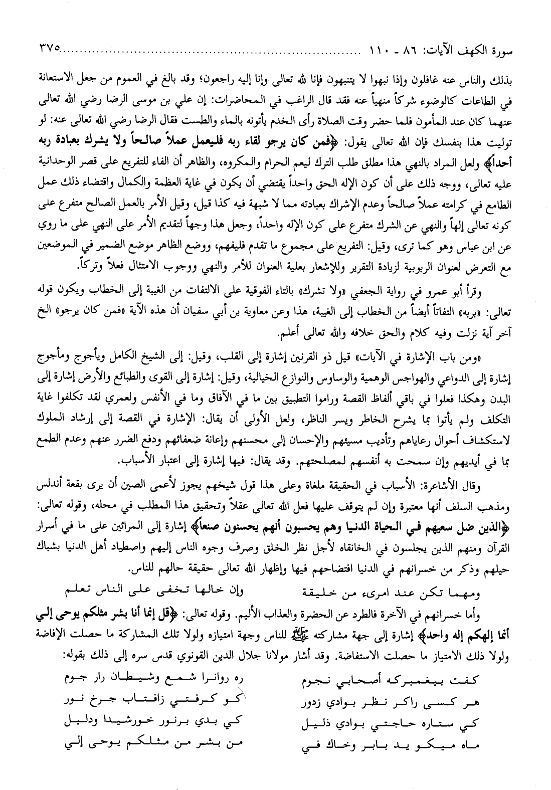 «ومن باب الإشارة في الآيات» قيل ذو القرنين إشارة إلى القلب، وقيل: إلى الشيخ الكامل ويأجوج ومأجوج إشارة إلى الدواعي والهواجس الوهمية والوساوس والنوازع الخيالية، وقيل: إشارة إلى القوى والطبائع والأرض إشارة إلى البدن وهكذا فعلوا في باقي ألفاظ القصة وراموا التطبيق بين ما في الآفاق وما في الأنفس ولعمري لقد تكلفوا غاية التكلف ولم يأتوا بما يشرح الخاطر ويسر الناظر، ولعل الأولى أن يقال: الإشارة في القصة إلى إرشاد الملوك لاستكشاف أحوال رعاياهم وتأديب مسيئهم والإحسان إلى محسنهم وإعانة ضعفائهم ودفع الضرر عنهم وعدم الطمع بما في أيديهم وإن سمحت به أنفسهم لمصلحتهم. وقد يقال: فيها إشارة إلى اعتبار الأسباب.