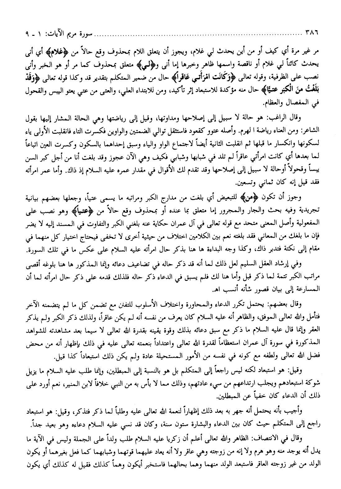 مر غير مرة أي كيف أو من أين يحدث لي غلام، ويجوز أن يتعلق اللام بمحذوف وقع حالا من غُلامٌ أي أنى يحدث كائنا لي غلام أو ناقصة واسمها ظاهر وخبرها إما أنى ولِي متعلق بمحذوف كما مر أو هو الخبر وأنى نصب على الظرفية، وقوله تعالى وَكانَتِ امْرَأَتِي عاقِراً حال من ضمير المتكلم بتقدير قد وكذا قوله تعالى وَقَدْ بَلَغْتُ مِنَ الْكِبَرِ عِتِيًّا حال منه مؤكدة للاستبعاد إثر تأكيد، ومن للابتداء العلي، والعتى من عتي يعتو اليبس والقحول في المفصال والعظام.