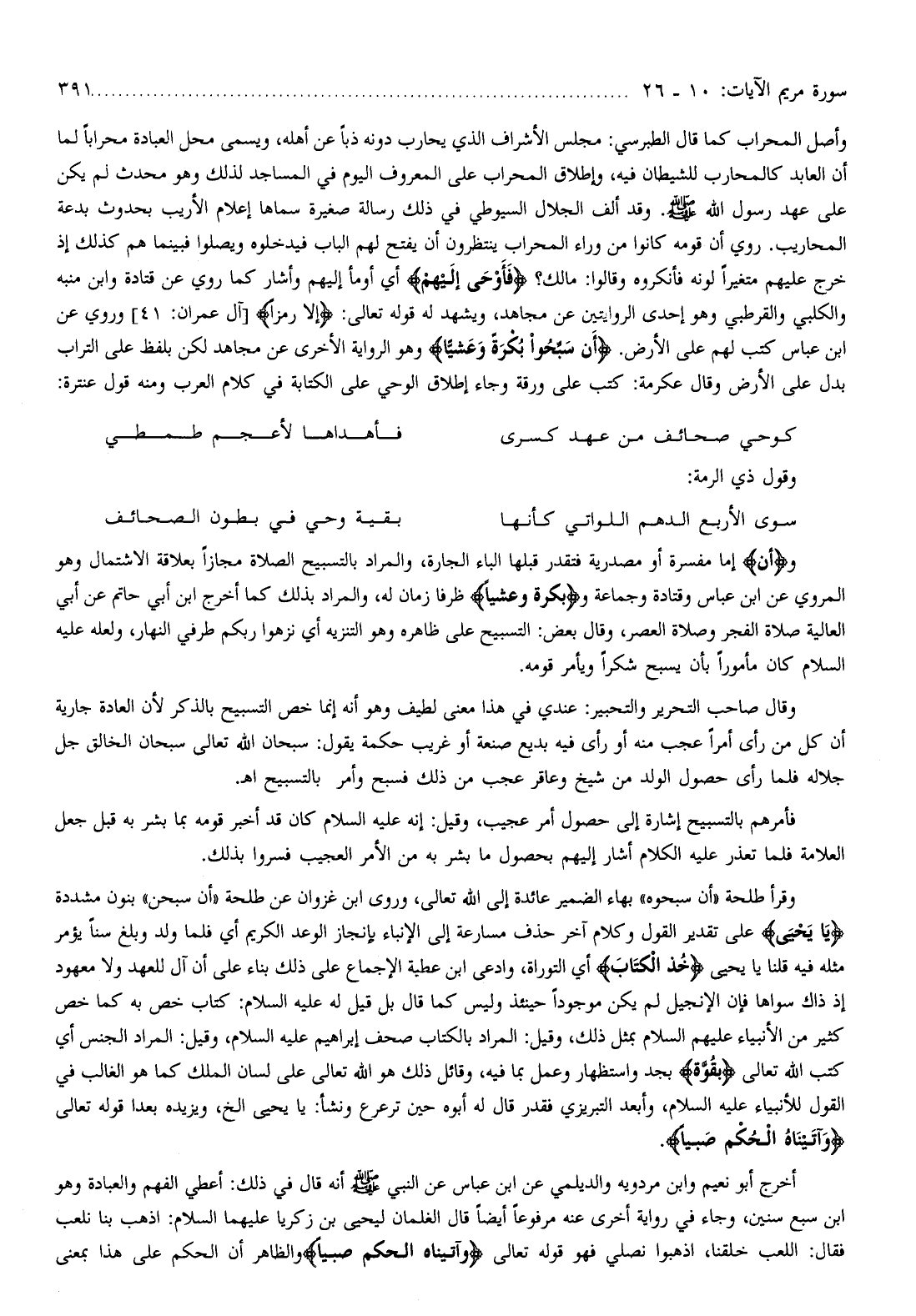 وأصل المحراب كما قال الطبرسي: مجلس الأشراف الذي يحارب دونه ذبا عن أهله، ويسمى محل العبادة محرابا لما أن العابد كالمحارب للشيطان فيه، وإطلاق المحراب على المعروف اليوم في المساجد لذلك وهو محدث لم يكن على عهد رسول الله صلّى الله عليه وسلّم. وقد ألف الجلال السيوطي في ذلك رسالة صغيرة سماها إعلام الأريب بحدوث بدعة المحاريب. روي أن قومه كانوا من وراء المحراب ينتظرون أن يفتح لهم الباب فيدخلوه ويصلوا فبينما هم كذلك إذ خرج عليهم متغيرا لونه فأنكروه وقالوا: مالك؟ فَأَوْحى إِلَيْهِمْ أي أومأ إليهم وأشار كما روي عن قتادة وابن منبه والكلبي والقرطبي وهو إحدى الروايتين عن مجاهد، ويشهد له قوله تعالى: إِلَّا رَمْزاً [آل عمران: 41] وروي عن ابن عباس كتب لهم على الأرض. أَنْ سَبِّحُوا بُكْرَةً وَعَشِيًّا وهو الرواية الأخرى عن مجاهد لكن بلفظ على التراب بدل على الأرض وقال عكرمة: كتب على ورقة وجاء إطلاق الوحي على الكتابة في كلام العرب ومنه قول عنترة: