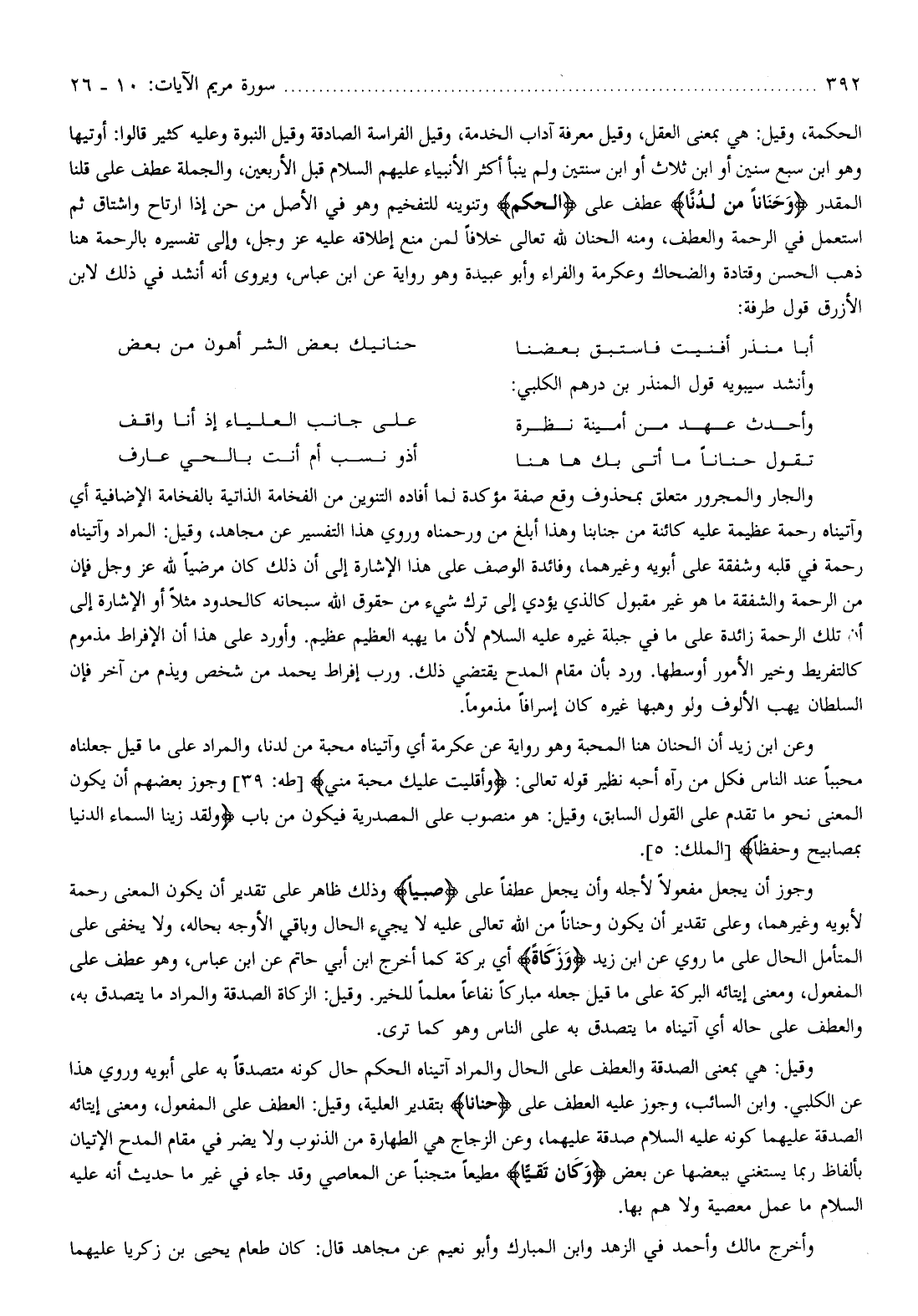 الحكمة، وقيل: هي بمعنى العقل، وقيل معرفة آداب الخدمة، وقيل الفراسة الصادقة وقيل النبوة وعليه كثير قالوا: أوتيها وهو ابن سبع سنين أو ابن ثلاث أو ابن سنتين ولم ينبأ أكثر الأنبياء عليهم السلام قبل الأربعين، والجملة عطف على قلنا المقدر وَحَناناً مِنْ لَدُنَّا عطف على الْحُكْمَ وتنوينه للتفخيم وهو في الأصل من حن إذا ارتاح واشتاق ثم استعمل في الرحمة والعطف، ومنه الحنان لله تعالى خلافا لمن منع إطلاقه عليه عز وجل، وإلى تفسيره بالرحمة هنا ذهب الحسن وقتادة والضحاك وعكرمة والفراء وأبو عبيدة وهو رواية عن ابن عباس، ويروى أنه أنشد في ذلك لابن الأزرق قول طرفة: