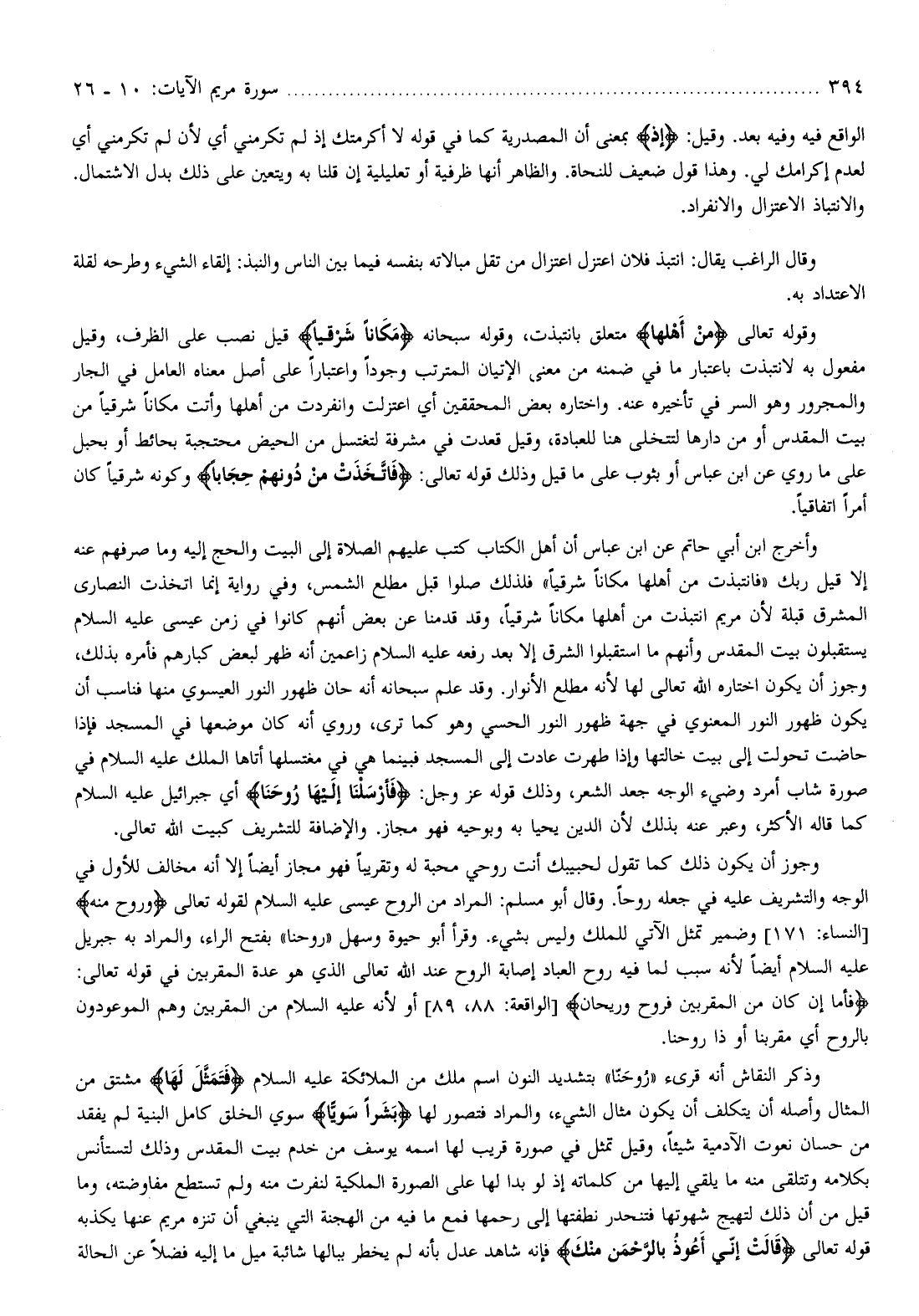 وأخرج ابن أبي حاتم عن ابن عباس أن أهل الكتاب كتب عليهم الصلاة إلى البيت والحج إليه وما صرفهم عنه إلا قيل ربك «فانتبذت من أهلها مكانا شرقيا» فلذلك صلوا قبل مطلع الشمس، وفي رواية إنما اتخذت النصارى المشرق قبلة لأن مريم انتبذت من أهلها مكانا شرقيا، وقد قدمنا عن بعض أنهم كانوا في زمن عيسى عليه السّلام يستقبلون بيت المقدس وأنهم ما استقبلوا الشرق إلا بعد رفعه عليه السّلام زاعمين أنه ظهر لبعض كبارهم فأمره بذلك، وجوز أن يكون اختاره الله تعالى لها لأنه مطلع الأنوار. وقد علم سبحانه أنه حان ظهور النور العيسوي منها فناسب أن يكون ظهور النور المعنوي في جهة ظهور النور الحسي وهو كما ترى، وروي أنه كان موضعها في المسجد فإذا حاضت تحولت إلى بيت خالتها وإذا طهرت عادت إلى المسجد فبينما هي في مغتسلها أتاها الملك عليه السّلام في صورة شاب أمرد وضيء الوجه جعد الشعر، وذلك قوله عز وجل: فَأَرْسَلْنا إِلَيْها رُوحَنا