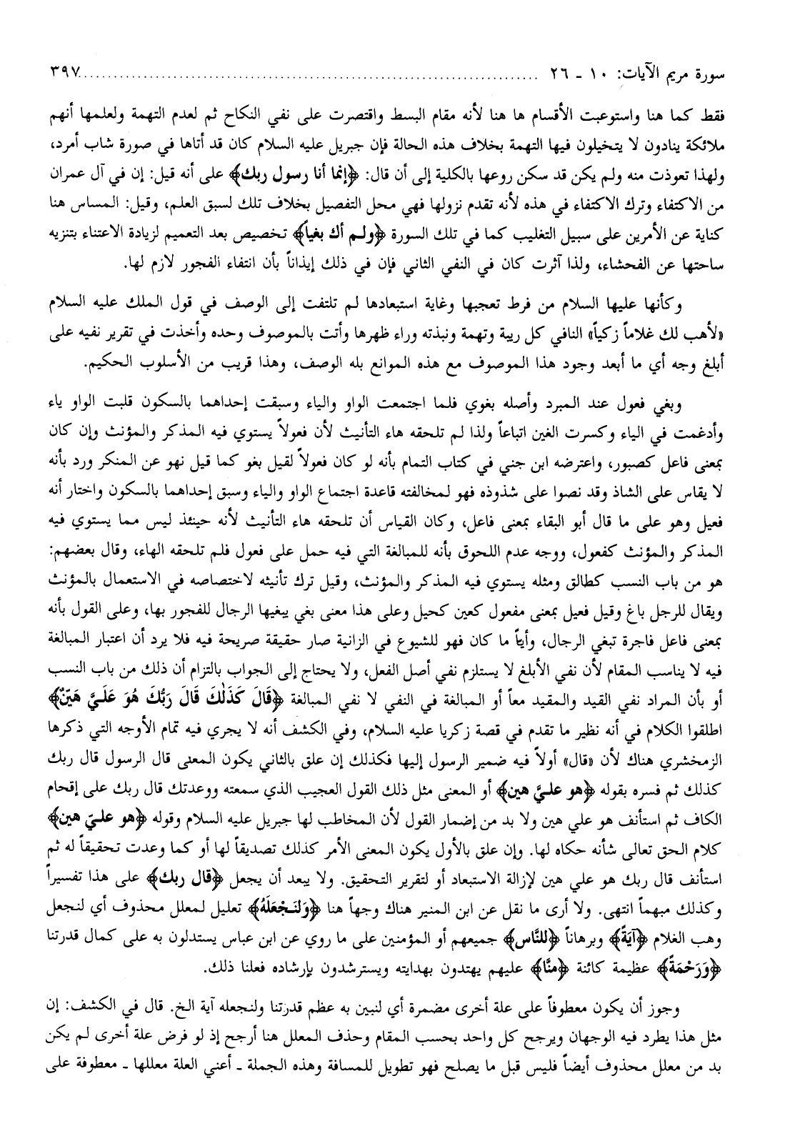 هو من باب النسب كطالق ومثله يستوي فيه المذكر والمؤنث، وقيل ترك تأنيثه لاختصاصه في الاستعمال بالمؤنث ويقال للرجل باغ وقيل فعيل بمعنى مفعول كعين كحيل وعلى هذا معنى بغي يبغيها الرجال للفجور بها، وعلى القول بأنه بمعنى فاعل فاجرة تبغي الرجال، وأيّا ما كان فهو للشيوع في الزانية صار حقيقة صريحة فيه فلا يرد أن اعتبار المبالغة فيه لا يناسب المقام لأن نفي الأبلغ لا يستلزم نفي أصل الفعل، ولا يحتاج إلى الجواب بالتزام أن ذلك من باب النسب أو بأن المراد نفي القيد والمقيد معا أو المبالغة في النفي لا نفي المبالغة قالَ كَذلِكِ قالَ رَبُّكِ هُوَ عَلَيَّ هَيِّنٌ أطلقوا الكلام في أنه نظير ما تقدم في قصة زكريا عليه السّلام، وفي الكشف أنه لا يجري فيه تمام الأوجه التي ذكرها الزمخشري هناك لأن «قال» أولا فيه ضمير الرسول إليها فكذلك إن علق بالثاني يكون المعنى قال الرسول قال ربك كذلك ثم فسره بقوله هُوَ عَلَيَّ هَيِّنٌ أو المعنى مثل ذلك القول العجيب الذي سمعته ووعدتك قال ربك على إقحام الكاف ثم استأنف هو علي هين ولا بد من إضمار القول لأن المخاطب لها جبريل عليه السّلام وقوله هُوَ عَلَيَّ هَيِّنٌ كلام الحق تعالى شأنه حكاه لها. وإن علق بالأول يكون المعنى الأمر كذلك تصديقا لها أو كما وعدت تحقيقا له ثم استأنف قال ربك هو علي هين لإزالة الاستبعاد أو لتقرير التحقيق. ولا يبعد أن يجعل قالَ رَبُّكِ على هذا تفسيرا وكذلك مبهما انتهى. ولا أرى ما نقل عن ابن المنير هناك وجها هنا وَلِنَجْعَلَهُ تعليل لمعلل محذوف أي لنجعل وهب الغلام آيَةً وبرهانا لِلنَّاسِ جميعهم أو المؤمنين على ما روي عن ابن عباس يستدلون به على كمال قدرتنا وَرَحْمَةً عظيمة كائنة مِنَّا عليهم يهتدون بهدايته ويسترشدون بإرشاده فعلنا ذلك.