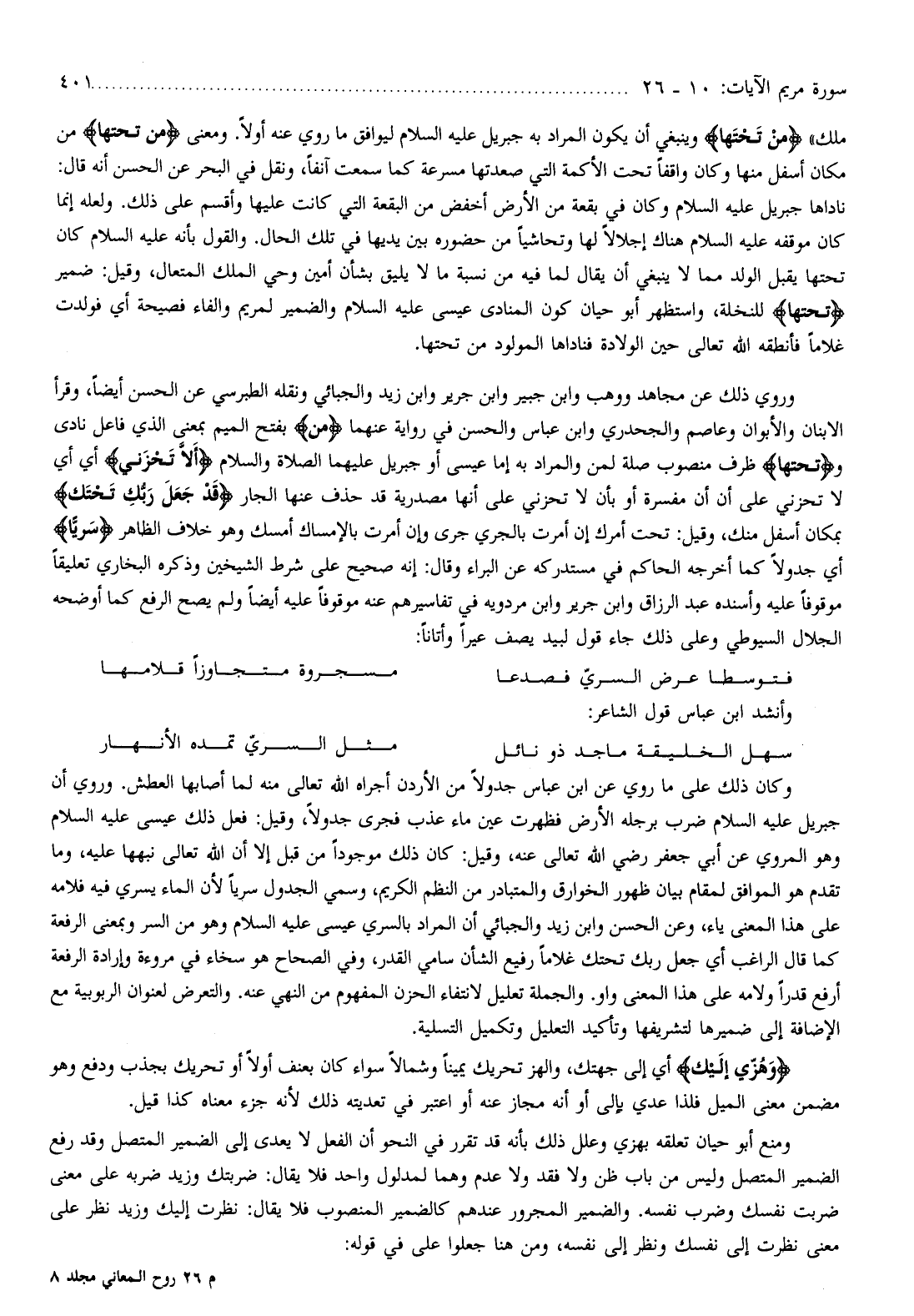 ، وقيل: كان ذلك موجودا من قبل إلا أن الله تعالى نبهها عليه، وما تقدم هو الموافق لمقام بيان ظهور الخوارق والمتبادر من النظم الكريم، وسمي الجدول سريا لأن الماء يسري فيه فلامه على هذا المعنى ياء، وعن الحسن وابن زيد والجبائي أن المراد بالسري عيسى عليه السّلام وهو من السر وبمعنى الرفعة كما قال الراغب أي جعل ربك تحتك غلاما رفيع الشأن سامي القدر، وفي الصحاح هو سخاء في مروءة وإرادة الرفعة أرفع قدرا ولامه على هذا المعنى واو. والجملة تعليل لانتفاء الحزن المفهوم من النهي عنه. والتعرض لعنوان الربوبية مع الإضافة إلى ضميرها لتشريفها وتأكيد التعليل وتكميل التسلية.