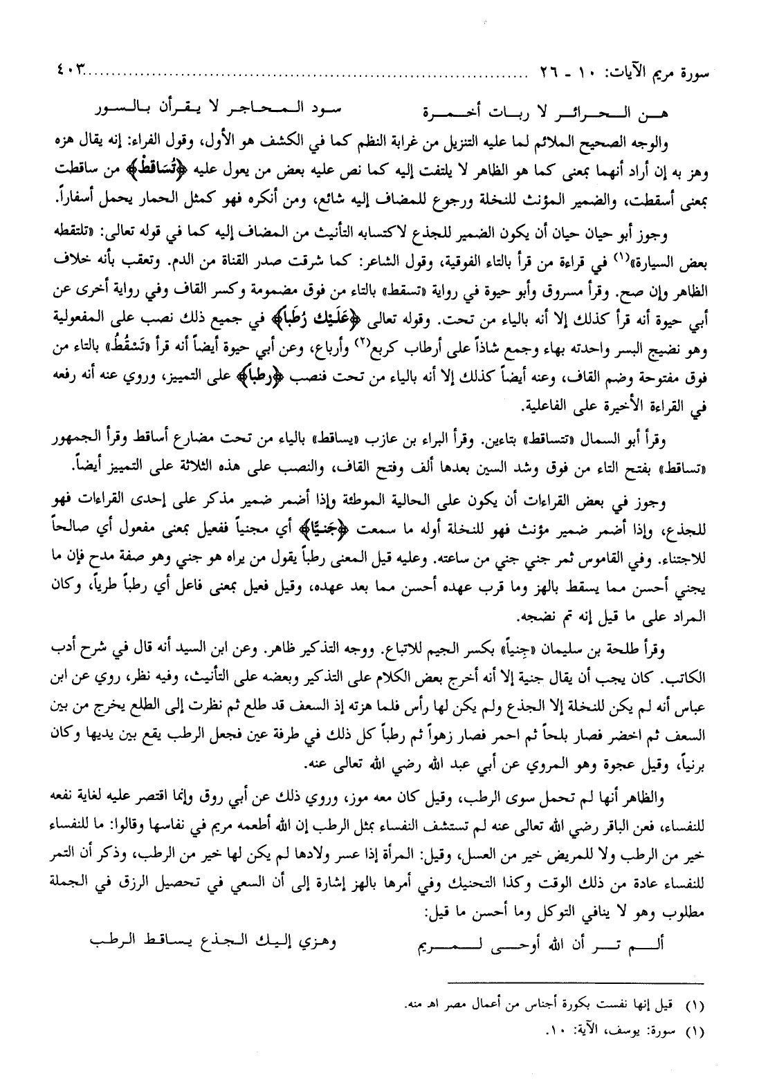 وجوز في بعض القراءات أن يكون على الحالية الموطئة وإذا أضمر ضمير مذكر على إحدى القراءات فهو للجذع، وإذا أضمر ضمير مؤنث فهو للنخلة أوله ما سمعت جَنِيًّا أي مجنيا ففعيل بمعنى مفعول أي صالحا للاجتناء. وفي القاموس ثمر جني جني من ساعته. وعليه قيل المعنى رطبا يقول من يراه هو جني وهو صفة مدح فإن ما يجني أحسن مما يسقط بالهز وما قرب عهده أحسن مما بعد عهده، وقيل فعيل بمعنى فاعل أي رطبا طريا، وكان المراد على ما قيل إنه تم نضجه.
