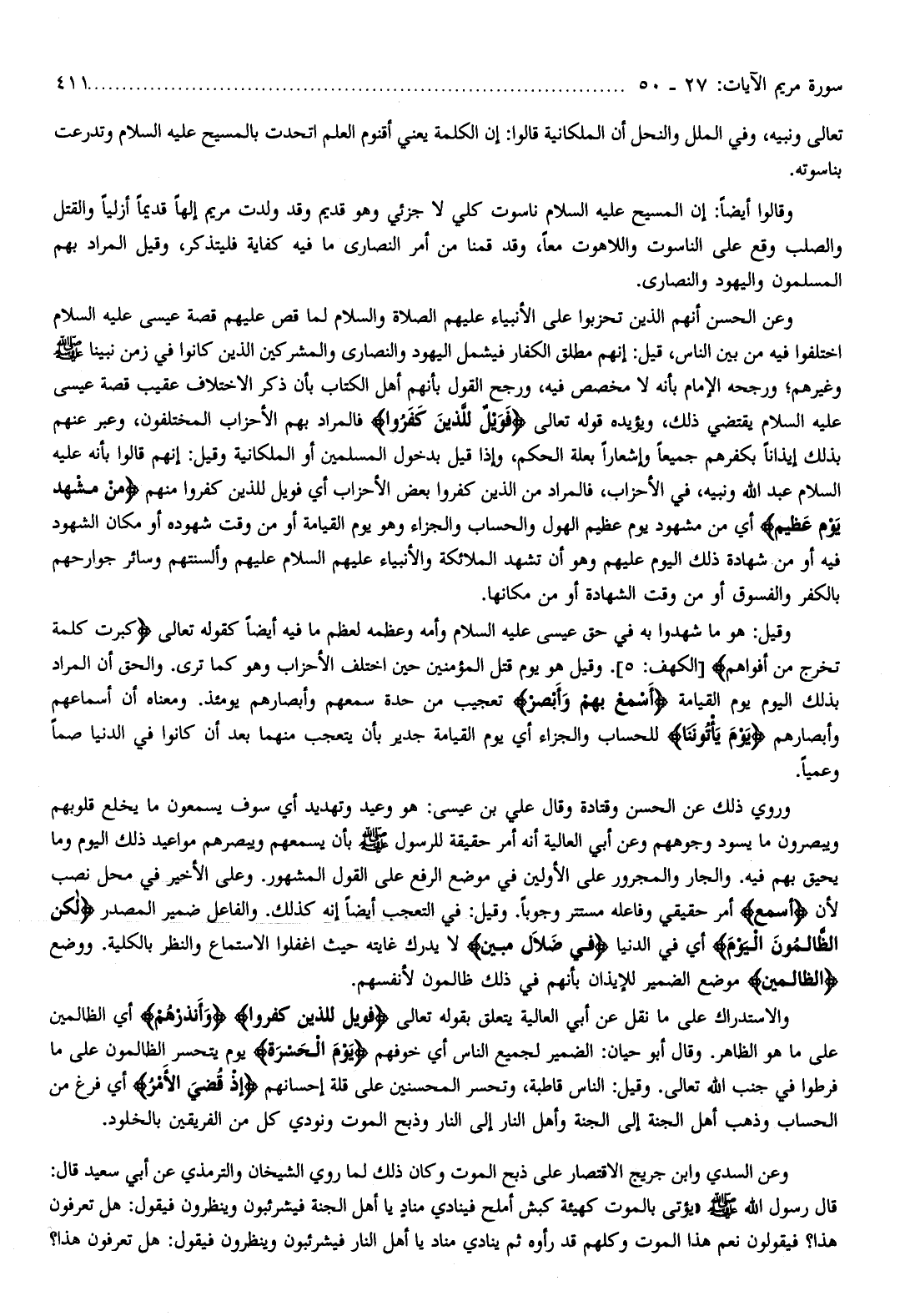 وعن الحسن أنهم الذين تحزبوا على الأنبياء عليهم الصلاة والسّلام لما قص عليهم قصة عيسى عليه السّلام اختلفوا فيه من بين الناس، قيل: إنهم مطلق الكفار فيشمل اليهود والنصارى والمشركين الذين كانوا في زمن نبينا صلّى الله عليه وسلّم وغيرهم ورجحه الإمام بأنه لا مخصص فيه، ورجح القول بأنهم أهل الكتاب بأن ذكر الاختلاف عقيب قصة عيسى عليه السّلام يقتضي ذلك، ويؤيده قوله تعالى فَوَيْلٌ لِلَّذِينَ كَفَرُوا فالمراد بهم الأحزاب المختلفون، وعبر عنهم بذلك إيذانا بكفرهم جميعا وإشعارا بعلة الحكم، وإذا قيل بدخول المسلمين أو الملكانية وقيل: إنهم قالوا بأنه عليه السّلام عبد الله ونبيه، في الأحزاب، فالمراد من الذين كفروا بعض الأحزاب أي فويل للذين كفروا منهم مِنْ مَشْهَدِ يَوْمٍ عَظِيمٍ أي من مشهود يوم عظيم الهول والحساب والجزاء وهو يوم القيامة أو من وقت شهوده أو مكان الشهود فيه أو من شهادة ذلك اليوم عليهم وهو أن تشهد الملائكة والأنبياء عليهم السّلام عليهم وألسنتهم وسائر جوارحهم بالكفر والفسوق أو من وقت الشهادة أو من مكانها.