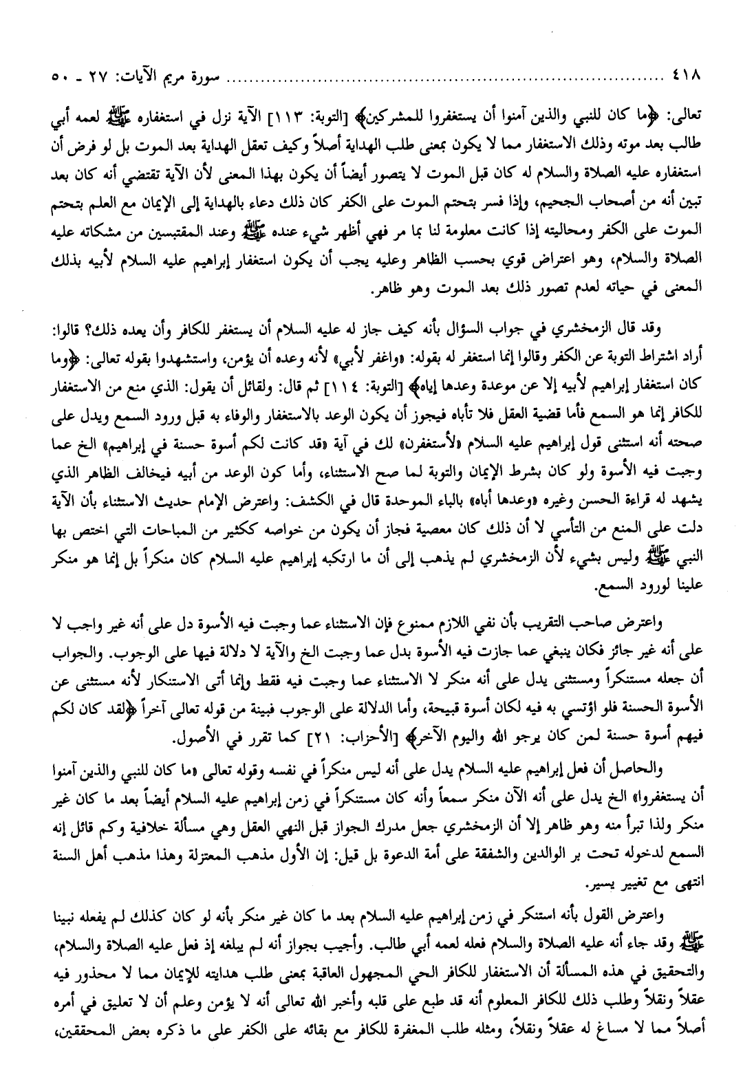 تعالى: ما كانَ لِلنَّبِيِّ وَالَّذِينَ آمَنُوا أَنْ يَسْتَغْفِرُوا لِلْمُشْرِكِينَ [التوبة: 113] الآية نزل في استغفاره صلّى الله عليه وسلّم لعمه أبي طالب بعد موته وذلك الاستغفار مما لا يكون بمعنى طلب الهداية أصلا وكيف تعقل الهداية بعد الموت بل لو فرض أن استغفاره عليه الصلاة والسّلام له كان قبل الموت لا يتصور أيضا أن يكون بهذا المعنى لأن الآية تقتضي أنه كان بعد تبين أنه من أصحاب الجحيم، وإذا فسر بتحتم الموت على الكفر كان ذلك دعاء بالهداية إلى الإيمان مع العلم بتحتم الموت على الكفر ومحاليته إذا كانت معلومة لنا بما مر فهي أظهر شيء عنده صلّى الله عليه وسلّم وعند المقتبسين من مشكاته عليه الصلاة والسّلام، وهو اعتراض قوي بحسب الظاهر وعليه يجب أن يكون استغفار إبراهيم عليه السّلام لأبيه بذلك المعنى في حياته لعدم تصور ذلك بعد الموت وهو ظاهر.