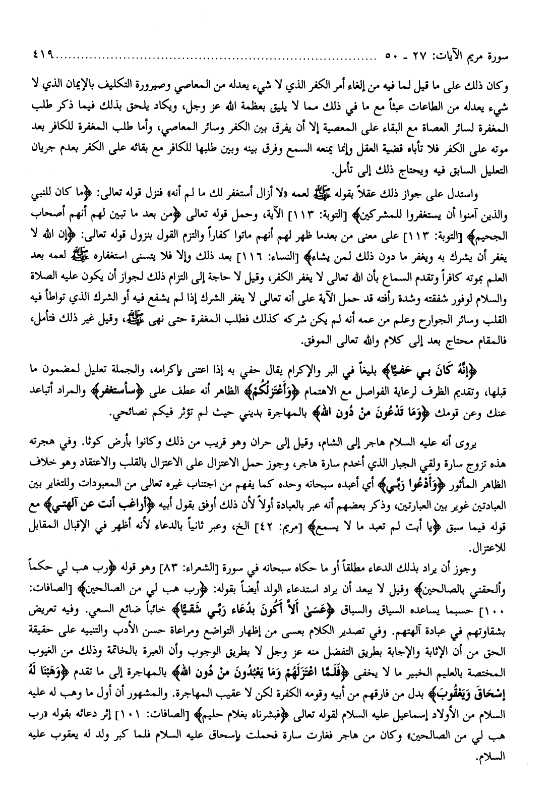 100] حسبما يساعده السياق والسباق عَسى أَلَّا أَكُونَ بِدُعاءِ رَبِّي شَقِيًّا خائبا ضائع السعي. وفيه تعريض بشقاوتهم في عبادة آلهتهم. وفي تصدير الكلام بعسى من إظهار التواضع ومراعاة حسن الأدب والتنبيه على حقيقة الحق من أن الإثابة والإجابة بطريق التفضل منه عز وجل لا بطريق الوجوب وأن العبرة بالخاتمة وذلك من الغيوب المختصة بالعليم الخبير ما لا يخفى فَلَمَّا اعْتَزَلَهُمْ وَما يَعْبُدُونَ مِنْ دُونِ اللَّهِ بالمهاجرة إلى ما تقدم وَهَبْنا لَهُ إِسْحاقَ وَيَعْقُوبَ بدل من فارقهم من أبيه وقومه الكفرة لكن لا عقيب المهاجرة. والمشهور أن أول ما وهب له عليه السّلام من الأولاد إسماعيل عليه السّلام لقوله تعالى فَبَشَّرْناهُ بِغُلامٍ حَلِيمٍ [الصافات: 101] إثر دعائه بقوله «رب هب لي من الصالحين» وكان من هاجر فغارت سارة فحملت بإسحاق عليه السّلام فلما كبر ولد له يعقوب عليه السّلام.