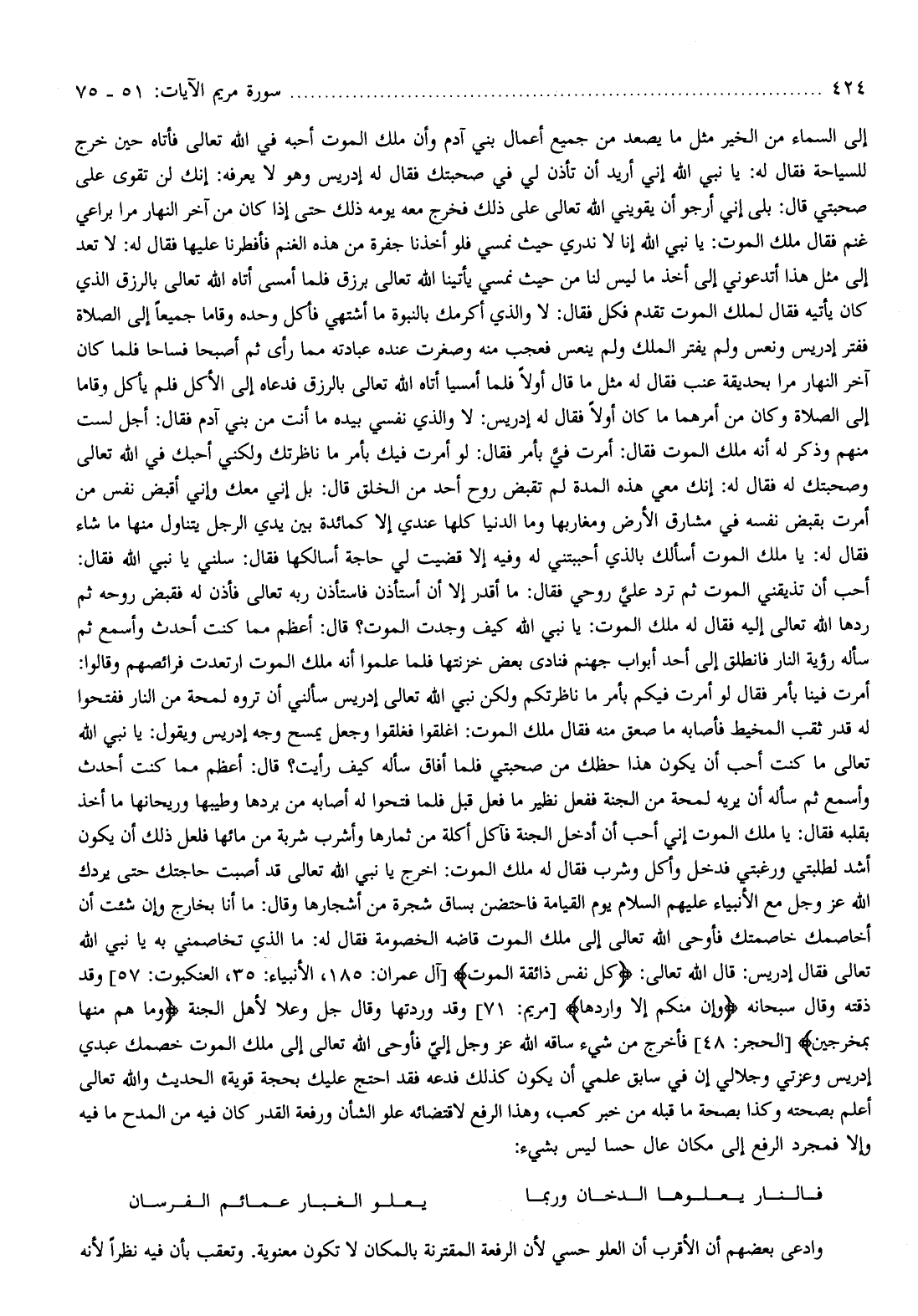 أمرت فينا بأمر فقال لو أمرت فيكم بأمر ما ناظرتكم ولكن نبي الله تعالى إدريس سألني أن تروه لمحة من النار ففتحوا له قدر ثقب المخيط فأصابه ما صعق منه فقال ملك الموت: أغلقوا فغلقوا وجعل يمسح وجه إدريس ويقول: يا نبي الله تعالى ما كنت أحب أن يكون هذا حظك من صحبتي فلما أفاق سأله كيف رأيت قال: أعظم مما كنت أحدث وأسمع ثم سأله أن يريه لمحة من الجنة ففعل نظير ما فعل قبل فلما فتحوا له أصابه من بردها وطيبها وريحانها ما أخذ بقلبه فقال: يا ملك الموت إني أحب أن أدخل الجنة فآكل أكلة من ثمارها وأشرب شربة من مائها فلعل ذلك أن يكون أشد لطلبتي ورغبتي فدخل وأكل وشرب فقال له ملك الموت: اخرج يا نبي الله تعالى قد أصبت حاجتك حتى يردك الله عز وجل مع الأنبياء عليهم السّلام يوم القيامة فاحتضن بساق شجرة من أشجارها وقال: ما أنا بخارج وإن شئت أن أخاصمك خاصمتك فأوحى الله تعالى إلى ملك الموت قاضه الخصومة فقال له: ما الذي تخاصمني به يا نبي الله تعالى فقال إدريس: قال الله تعالى: كُلُّ نَفْسٍ ذائِقَةُ الْمَوْتِ [آل عمران: 185، الأنبياء: 35، العنكبوت: 57] وقد ذقته وقال سبحانه وَإِنْ مِنْكُمْ إِلَّا وارِدُها [مريم: 71] وقد وردتها وقال جل وعلا لأهل الجنة وَما هُمْ مِنْها بِمُخْرَجِينَ [الحجر: 48] فأخرج من شيء ساقه الله عز وجل إليّ فأوحى الله تعالى إلى ملك الموت خصمك عبدي إدريس وعزتي وجلالي إن في سابق علمي أن يكون كذلك فدعه فقد احتج عليك بحجة قوية» الحديث