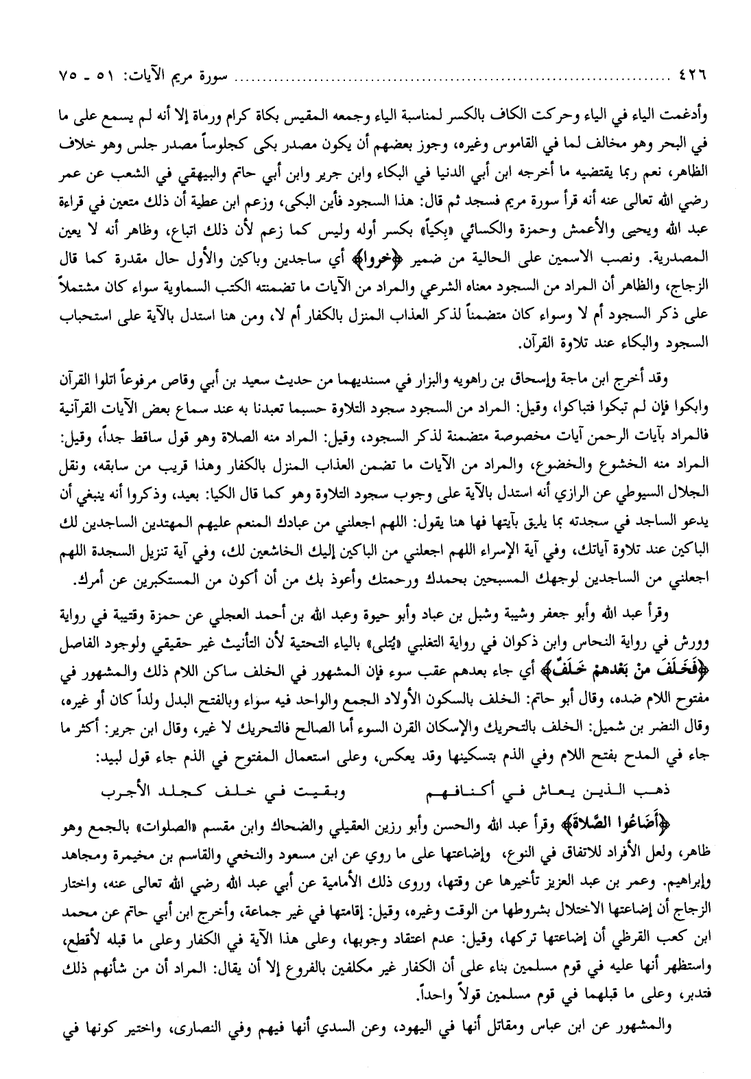، وقيل: المراد من السجود سجود التلاوة حسبما تعبدنا به عند سماع بعض الآيات القرآنية فالمراد بآيات الرحمن آيات مخصوصة متضمة لذكر السجود، وقيل: المراد منه الصلاة وهو قول ساقط جدا، وقيل: