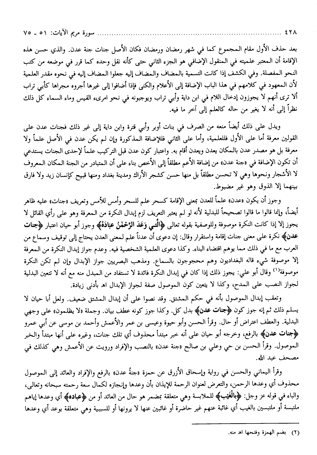 وجوز أن يكون «عدن» علما للعدن بمعنى الإقامة كسحر علم للسحر وأمس للأمس وتعريف «جنات» عليه ظاهر أيضا، وإنما قالوا تصحيحا للبدلية لأنه لو لم يعتبر التعريف لزم إبدال النكرة من المعرفة وهو على رأي القائل لا يجوز إلا إذا كانت النكرة موصوفة وللوصفية بقوله تعالى الَّتِي وَعَدَ الرَّحْمنُ عِبادَهُ وجوز أبو حيان اعتبار جَنَّاتِ عَدْنٍ نكرة على معنى جنات إقامة واستقرار وقال: إن دعوى أن عدنا علم لمعنى العدن يحتاج إلى توقيف وسماع من العرب مع ما في ذلك مما يوهم اقتضاء البناء. وكذا دعوى العلمية الشخصية فيه. وعدم جواز إبدال النكرة من المعرفة إلا موصوفة شيء قاله البغداديون وهم محجوجون بالسماع. ومذهب البصريين جواز الإبدال وإن لم تكن النكرة موصوفة (¬1) وقال أبو علي: يجوز ذلك إذا كان في إبدال النكرة فائدة لا تستفاد من المبدل منه مع أنه لا تتعين البدلية لجواز النصب على المدح، وكذا لا يتعين كون الموصول صفة لجواز الإبدال اه بأدنى زيادة.