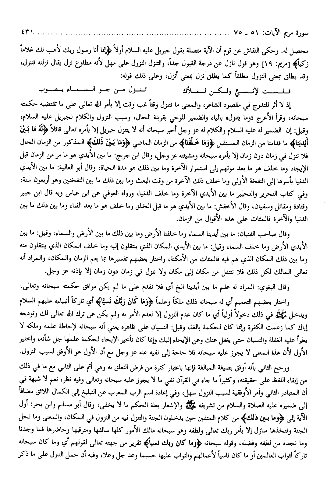 ورجح الثاني بأنه أوفق بصيغة المبالغة فإنها باعتبار كثرة من فرض التعلق به وهي أتم على الثاني مع ما في ذلك من إبقاء اللفظ على حقيقته، وكثيرا ما جاء في القرآن نفي ما لا يجوز عليه سبحانه وتعالى وفيه نظر، نعم لا شبهة في أن المتبادر الثاني وأمر الأوفقية لسبب النزول سهل، وفي إعادة اسم الرب المعرب عن التبليغ إلى الكمال اللائق مضافا إلى ضميره عليه الصلاة والسّلام من تشريفه صلّى الله عليه وسلّم والإشعار بعلة الحكم ما لا يخفى، وقال أبو مسلم وابن بحر: أول الآية إلى وَما بَيْنَ ذلِكَ من كلام المتقين حين يدخلون الجنة والتنزل فيه من النزول في المكان، والمعنى وما نحل الجنة ونتخذها منازل إلا بأمر ربك تعالى ولطفه وهو سبحانه مالك الأمور كلها سالفها ومترقبها وحاضرها فما وجدنا وما نجده من لطفه وفضله، وقوله سبحانه وَما كانَ رَبُّكَ نَسِيًّا تقرير من جهته تعالى لقولهم أي وما كان سبحانه تاركا لثواب العالمين أو ما كان ناسيا لأعمالهم والثواب عليها حسبما وعد جل وعلا، وفيه أن حمل التنزل على ما ذكر