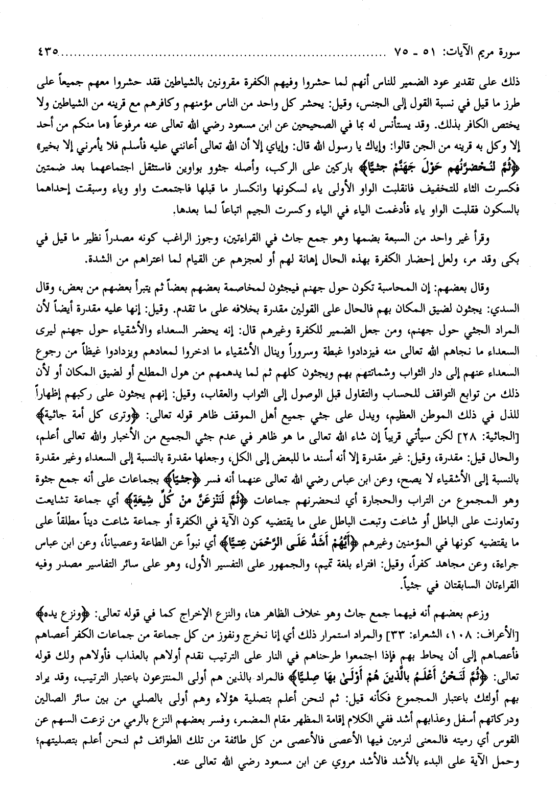 وقال بعضهم: إن المحاسبة تكون حول جهنم فيجثون لمخاصمة بعضهم بعضا ثم يتبرأ بعضهم من بعض، وقال السدي: يجثون لضيق المكان بهم فالحال على القولين مقدرة بخلافه على ما تقدم. وقيل: إنها عليه مقدرة أيضا لأن المراد الجثي حول جهنم، ومن جعل الضمير للكفرة وغيرهم قال: إنه يحضر السعداء والأشقياء حول جهنم ليرى السعداء ما نجاهم الله تعالى منه فيزدادوا غبطة وسرورا وينال الأشقياء ما ادخروا لمعادهم ويزدادوا غيظا من رجوع السعداء عنهم إلى دار الثواب وشماتتهم بهم ويجثون كلهم ثم لما يدهمهم من هول المطلع أو لضيق المكان أو لأن ذلك من توابع التواقف للحساب والتقاول قبل الوصول إلى الثواب والعقاب، وقيل: إنهم يجثون على ركبهم إظهارا للذل في ذلك الموطن العظيم، ويدل على جثي جميع أهل الموقف ظاهر قوله تعالى: وَتَرى كُلَّ أُمَّةٍ جاثِيَةً [الجاثية: 28] لكن سيأتي قريبا إن شاء الله تعالى ما هو ظاهر في عدم جثي الجميع من الأخبار والله تعالى أعلم، والحال قيل: مقدرة، وقيل: غير مقدرة إلا أنه أسند ما للبعض إلى الكل، وجعلها مقدرة بالنسبة إلى السعداء وغير مقدرة بالنسبة إلى الأشقياء لا يصح، وعن ابن عباس رضي الله تعالى عنهما أنه فسر جِثِيًّا بجماعات على أنه جمع جثوة وهو المجموع من التراب والحجارة أي لنحضرنهم جماعات ثُمَّ لَنَنْزِعَنَّ مِنْ كُلِّ شِيعَةٍ أي جماعة تشايعت وتعاونت على الباطل أو شاعت وتبعت الباطل على ما يقتضيه كون الآية في الكفرة أو جماعة شاعت دينا مطلقا على ما يقتضيه كونها في المؤمنين وغيرهم أَيُّهُمْ أَشَدُّ عَلَى الرَّحْمنِ عِتِيًّا أي نبوا عن الطاعة وعصيانا، وعن ابن عباس جراءة، وعن مجاهد كفرا، وقيل: افتراء بلغة تميم، والجمهور على التفسير الأول، وهو على سائر التفاسير مصدر وفيه القراءتان السابقتان في جثيا.