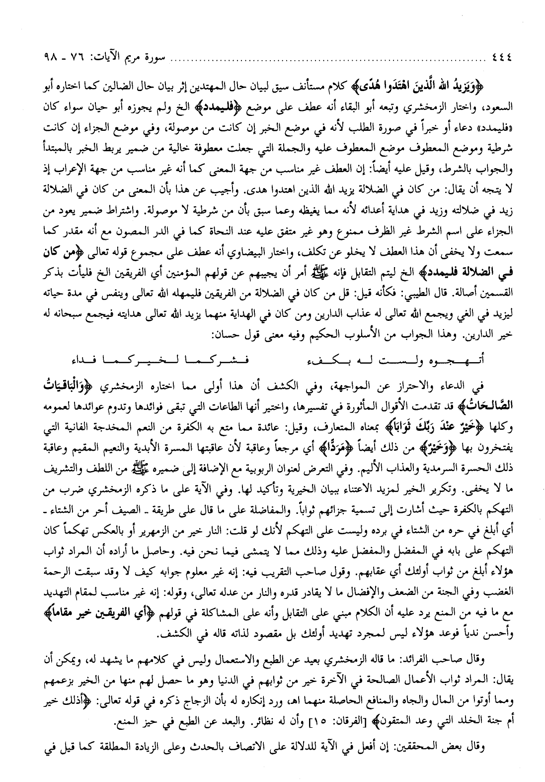 وَيَزِيدُ اللَّهُ الَّذِينَ اهْتَدَوْا هُدىً كلام مستأنف سيق لبيان حال المهتدين إثر بيان حال الضالين كما اختاره أبو السعود، واختار الزمخشري وتبعه أبو البقاء أنه عطف على موضع فَلْيَمْدُدْ إلخ ولم يجوزه أبو حيان سواء كان «فليمدد» دعاء أو خبرا في صورة الطلب لأنه في موضع الخبر إن كانت من موصولة، وفي موضع الجزاء إن كانت شرطية وموضع المعطوف موضع المعطوف عليه والجملة التي جعلت معطوفة خالية من ضمير يربط الخبر بالمبتدأ والجواب بالشرط، وقيل عليه أيضا: إن العطف غير مناسب من جهة المعنى كما أنه غير مناسب من جهة الإعراب إذ لا يتجه أن يقال: من كان في الضلالة يزيد الله الذين اهتدوا هدى. وأجيب عن هذا بأن المعنى من كان في الضلالة زيد في ضلالته وزيد في هداية أعدائه لأنه مما يغيظه وعما سبق بأن من شرطية لا موصولة. اشتراط ضمير يعود من الجزاء على اسم الشرط غير الظرف ممنوع وهو غير متفق عليه عند النحاة كما في الدر المصون مع أنه مقدر كما سمعت ولا يخفى أن هذا العطف لا يخلو عن تكلف، واختار البيضاوي أنه عطف على مجموع قوله تعالى مَنْ كانَ فِي الضَّلالَةِ فَلْيَمْدُدْ إلخ ليتم التقابل فإنه صلّى الله عليه وسلّم أمر أن يجيبهم عن قولهم المؤمنين أي الفريقين إلخ فليأت بذكر القسمين أصالة. قال الطيبي: فكأنه قيل: قل من كان في الضلالة من الفريقين فليمهله الله تعالى وينفس في مدة حياته ليزيد في الغي ويجمع الله تعالى له عذاب الدارين ومن كان في الهداية منهما يزيد الله تعالى هدايته فيجمع سبحانه له خير الدارين. وهذا الجواب من الأسلوب الحكيم وفيه معنى قول حسان: