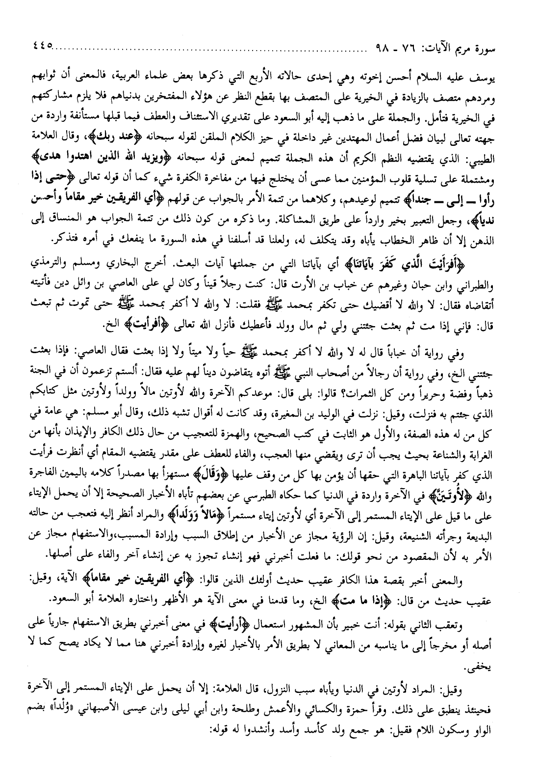 أَفَرَأَيْتَ الَّذِي كَفَرَ بِآياتِنا أي بآياتنا التي من جملتها آيات البعث. أخرج البخاري ومسلم والترمذي والطبراني وابن حبان وغيرهم عن خباب بن الأرت قال: كنت رجلا قينا وكان لي على العاصي بن وائل دين فأتيته أتقاضاه فقال: لا والله لا أقضيك حتى تكفر بمحمد صلّى الله عليه وسلّم فقلت: لا والله لا أكفر بمحمد صلّى الله عليه وسلّم حتى تموت ثم تبعث قال: فإني إذا مت ثم بعثت جئتني ولي ثم مال وولد فأعطيك فأنزل الله تعالى أَفَرَأَيْتَ إلخ.