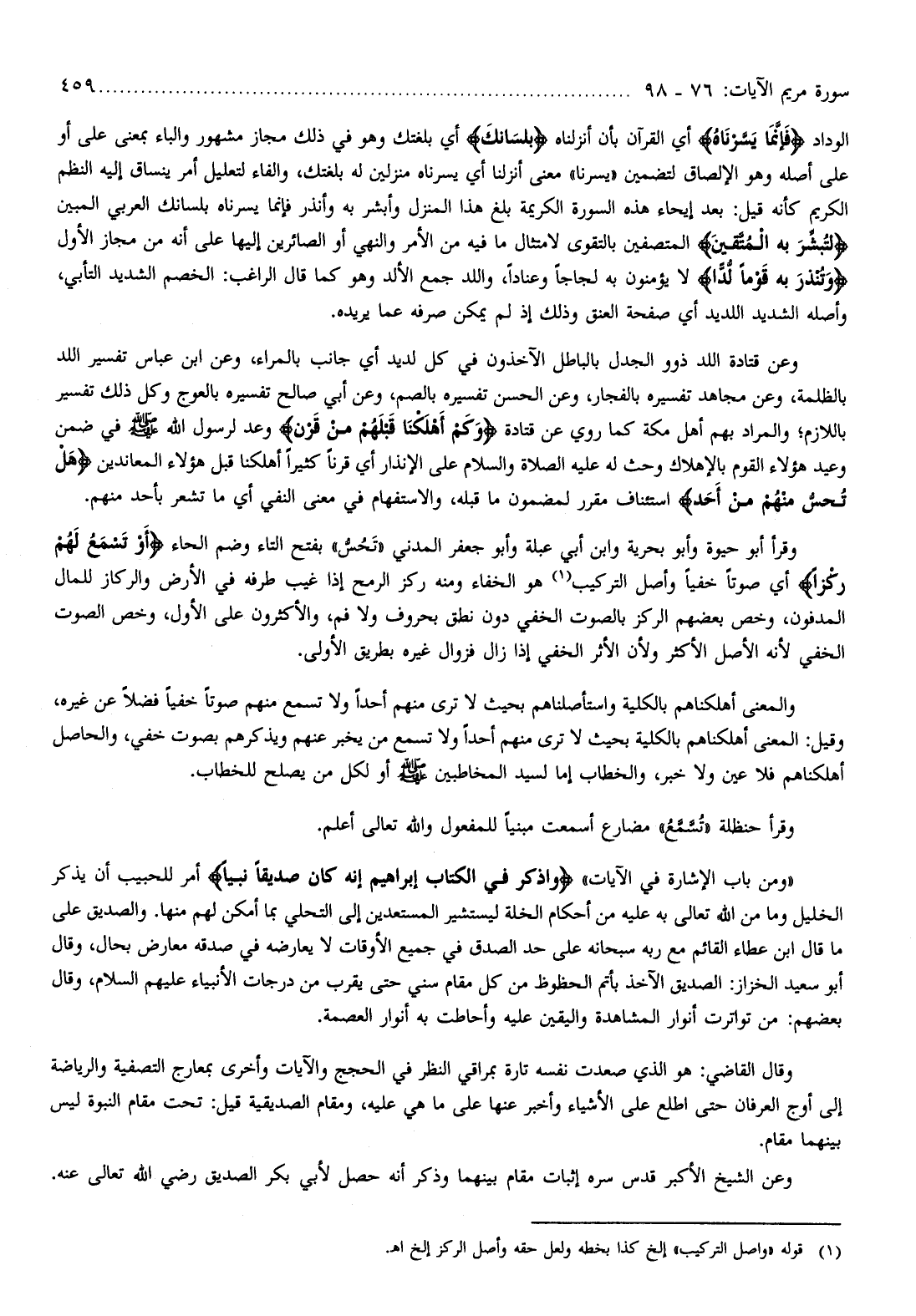 «ومن باب الإشارة في الآيات» وَاذْكُرْ فِي الْكِتابِ إِبْراهِيمَ إِنَّهُ كانَ صِدِّيقاً نَبِيًّا أمر للحبيب أن يذكر الخليل وما من الله تعالى به عليه من أحكام الخلة ليستشير المستعدين إلى التحلي بما أمكن لهم منها. والصديق على ما قال ابن عطاء القائم مع ربه سبحانه على حد الصدق في جميع الأوقات لا يعارضه في صدقه معارض بحال، وقال أبو سعيد الخزاز: الصديق الآخذ بأتم الحظوظ من كل مقام سني حتى يقرب من درجات الأنبياء عليهم السلام، وقال بعضهم: من تواترت أنوار المشاهدة واليقين عليه وأحاطت به أنوار العصمة.