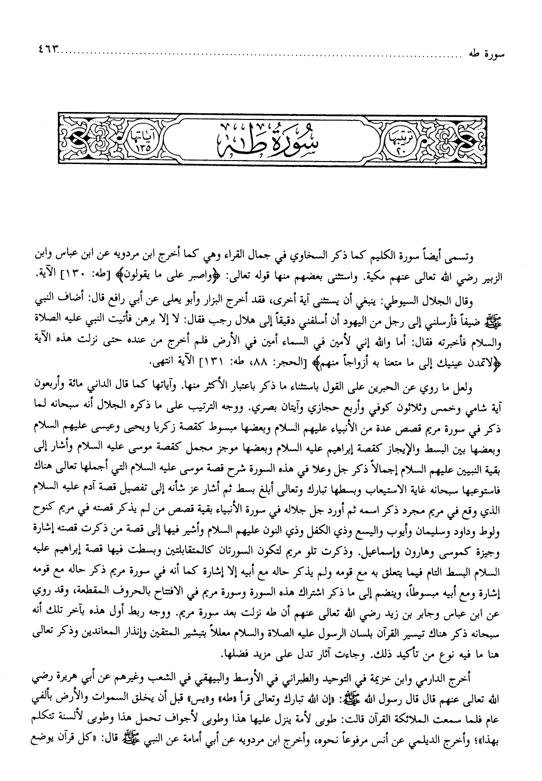 أخرج الدارمي وابن خزيمة في التوحيد والطبراني في الأوسط والبيهقي في الشعب وغيرهم عن أبي هريرة رضي الله تعالى عنهم قال قال رسول الله صلّى الله عليه وسلّم: «إن الله تبارك وتعالى قرأ «طه» و «يس» قبل أن يخلق السموات والأرض بألفي عام فلما سمعت الملائكة القرآن قالت: طوبى لأمة ينزل عليها هذا وطوبى لأجواف تحمل هذا وطوبى لألسنة تتكلم بهذا» وأخرج الديلمي عن أنس مرفوعا نحوه