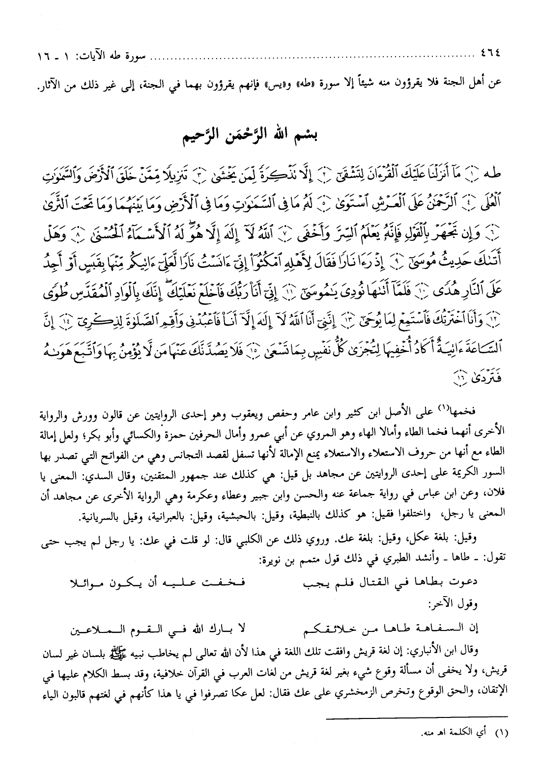 فخمها (¬1) على الأصل ابن كثير وابن عامر وحفص ويعقوب وهو إحدى الروايتين عن قالون وورش والرواية الأخرى أنهما فخما الطاء وأمالا الهاء وهو المروي عن أبي عمرو وأمال الحرفين حمزة والكسائي وأبو بكر ولعل إمالة الطاء مع أنها من حروف الاستعلاء والاستعلاء يمنع الإمالة لأنها تسفل لقصد التجانس وهي من الفواتح التي تصدر بها السور الكريمة على إحدى الروايتين عن مجاهد بل قيل: هي كذلك عند جمهور المتقنين، وقال السدي: المعنى يا فلان، وعن ابن عباس في رواية جماعة عنه والحسن وابن جبير وعطاء وعكرمة وهي الرواية الأخرى عن مجاهد أن المعنى يا رجل، واختلفوا فقيل: هو كذلك بالنبطية، وقيل: بالحبشية، وقيل: بالعبرانية، وقيل بالسريانية.