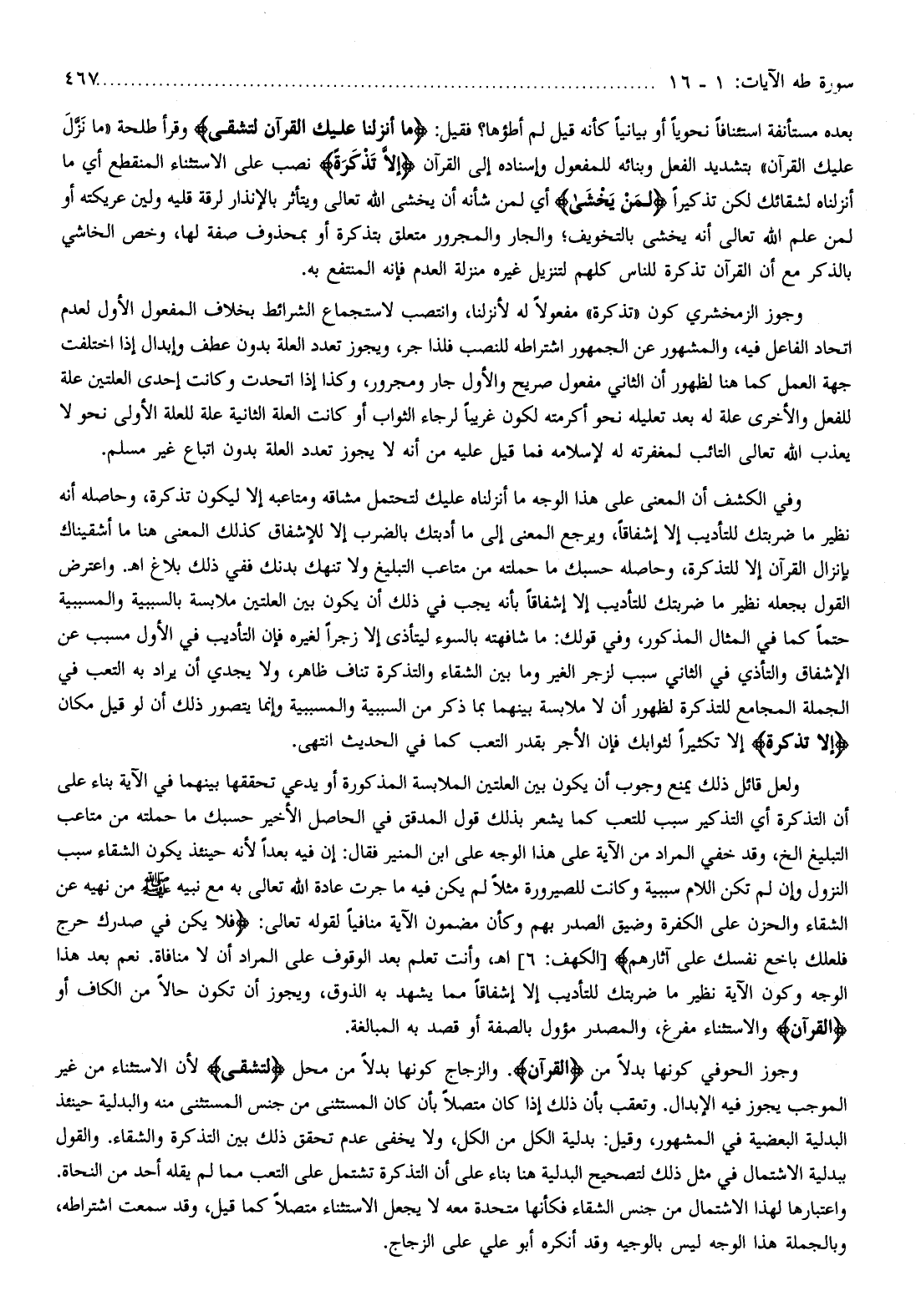 وفي الكشف أن المعنى على هذا الوجه ما أنزلناه عليك لتحتمل مشاقه ومتاعبه إلا ليكون تذكرة، وحاصله أنه نظير ما ضربتك للتأديب إلا إشفاقا، ويرجع المعنى إلى ما أدبتك بالضرب إلا للإشفاق كذلك المعنى هنا ما أشقيناك بإنزال القرآن إلا للتذكرة، وحاصله حسبك ما حملته من متاعب التبليغ ولا تنهك بدنك ففي ذلك بلاغ اه. واعترض القول بجعله نظير ما ضربتك للتأديب إلا إشفاقا بأنه يجب في ذلك أن يكون بين العلتين ملابسة بالسببية والمسببية حتما كما في المثال المذكور، وفي قولك: ما شافهته بالسوء ليتأذى إلا زجرا لغيره فإن التأديب في الأول مسبب عن الإشفاق والتأذي في الثاني سبب لزجر الغير وما بين الشقاء والتذكرة تناف ظاهر، ولا يجدي أن يراد به التعب في الجملة المجامع للتذكرة لظهور أن لا ملابسة بينهما بما ذكر من السببية والمسببية وإنما يتصور ذلك أن لو قيل مكان إِلَّا تَذْكِرَةً إلا تكثيرا لثوابك فإن الأجر بقدر التعب كما في الحديث انتهى.