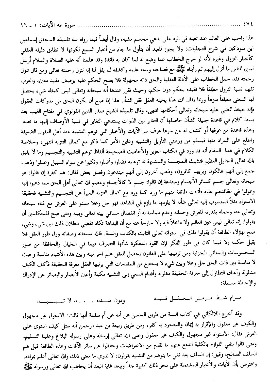 وهذه قاعدة من عرفها أو كشف له عن سرها عرف سر الآيات والأخبار التي توهم التشبيه عند أهل العقول الضعيفة واطلع على المراد منها فيسلم من ورطتي التأويل والتشبيه وعاين الأمر كما ذكر مع كمال التنزيه انتهى، وخلاصة الكلام في هذا المقام أنه قد ورد في الكتاب العزيز والأحاديث الصحيحة ألفاظ توهم التشبيه والتجسيم وما لا يليق بالله تعالى الجليل العظيم فتشبث المجسمة والمشبهة بما توهمه فضلوا وأضلوا ونكبوا عن سواء السبيل وعدلوا وذهب جمع إلى أنهم هالكون وبربهم كافرون، وذهب آخرون إلى أنهم مبتدعون وفصل بعض فقال: هم كفرة إن قالوا: هو سبحانه وتعالى جسم كسائر الأجسام ومبتدعة إن قالوا: جسم لا كالأجسام وعصم الله تعالى أهل الحق مما ذهبوا إليه وعولوا في عقائدهم عليه فأثبتت طائفة منهم ما ورد كما ورد مع كمال التنزيه المبرأ عن التجسيم والتشبيه فحقيقة الاستواء مثلا المنسوب إليه تعالى شأنه لا يلزمها ما يلزم في الشاهد فهو جل وعلا مستو على العرش مع غناه سبحانه وتعالى عنه وحمله بقدرته للعرش وحملته وعدم مماسة له أو انفصال مسافي بينه تعالى وبينه ومتى صح للمتكلمين أن يقولوا: إنه تعالى ليس عين العالم ولا داخلا فيه ولا خارجا عنه مع أن البداهة تكاد تقضي ببطلان ذلك بين شيء وشيء صح لهؤلاء الطائفة أن يقولوا ذلك في استوائه تعالى الثابت بالكتاب والسنة. فالله سبحانه وصفاته وراء طور العقل فلا يقبل حكمه إلا فيما كان في طور الفكر فإن القوة المفكرة شأنها التصرف فيما في الخيال والحافظة من صور المحسوسات والمعاني الجزئية ومن ترتيبها على القانون يحصل للعقل علم آخر بينه وبين هذه الأشياء مناسبة وحيث لا مناسبة بين ذات الحق جل وعلا وبين شيء لا يستنتج من المقدمات التي يرتبها العقل معرفة الحقيقة فأكف الكيف مشلولة وأعناق التطاول إلى معرفة الحقيقة مغلولة وأقدام السعي إلى التشبيه مكبلة وأعين الأبصار والبصائر عن الإدراك والإحاطة مسملة: