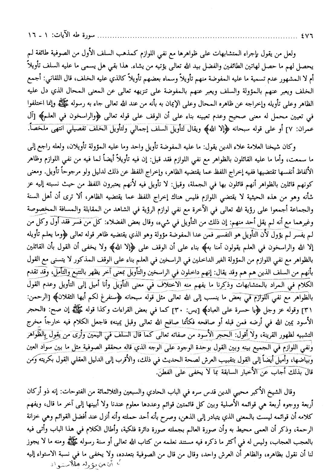 وكان شيخنا العلامة علاء الدين يقول: ما عليه المفوضة تأويل واحد وما عليه المؤولة تأويلان، ولعله راجع إلى ما سمعت، وأما ما عليه القائلون بالظواهر مع نفي اللوازم فقد قيل: إن فيه تأويلا أيضا لما فيه من نفي اللوازم وظاهر الألفاظ أنفسها تقتضيها ففيه إخراج اللفظ عما يقتضيه الظاهر، وإخراج اللفظ عن ذلك لدليل ولو مرجوحا تأويل. ومعنى كونهم قائلين بالظواهر أنهم قائلون بها في الجملة، وقيل: لا تأويل فيه لأنهم يعتبرون اللفظ من حيث نسبته إليه عز شأنه وهو من هذه الحيثية لا يقتضي اللوازم فليس هناك إخراج اللفظ عما يقتضيه الظاهر، ألا ترى أن أهل السنة والجماعة أجمعوا على رؤية الله تعالى في الآخرة مع نفي لوازم الرؤية في الشاهد من المقابلة والمسافة المخصوصة وغيرهما مع أنه لم يقل أحد منهم: إن ذلك من التأويل في شيء، وقال بعض الفضلاء: كل من فسر فقد أول وكل من لم يفسر لم يؤول لأن التأويل هو التفسير فمن عدا المفوضة مؤولة وهو الذي يقتضيه ظاهر قوله تعالى وَما يَعْلَمُ تَأْوِيلَهُ إِلَّا اللَّهُ وَالرَّاسِخُونَ فِي الْعِلْمِ يَقُولُونَ آمَنَّا بِهِ بناء على أن الوقف على إِلَّا اللَّهُ ولا يخفى أن القول بأن القائلين بالظواهر مع نفي اللوازم من المؤولة الغير الداخلين في الراسخين في العلم بناء على الوقف المذكور لا يتسنى مع القول بأنهم من السلف الذين هم هم وقد يقال: إنهم داخلون في الراسخين والتأويل بمعنى آخر يظهر بالتتبع والتأمل، وقد تقدم الكلام في المراد بالمتشابهات وذكرنا ما يفهم منه الاختلاف في معنى التأويل وأنا أميل إلى التأويل وعدم القول بالظواهر مع نفي اللوازم في بعض ما ينسب إلى الله تعالى مثل قوله سبحانه سَنَفْرُغُ لَكُمْ أَيُّهَ الثَّقَلانِ [الرحمن: