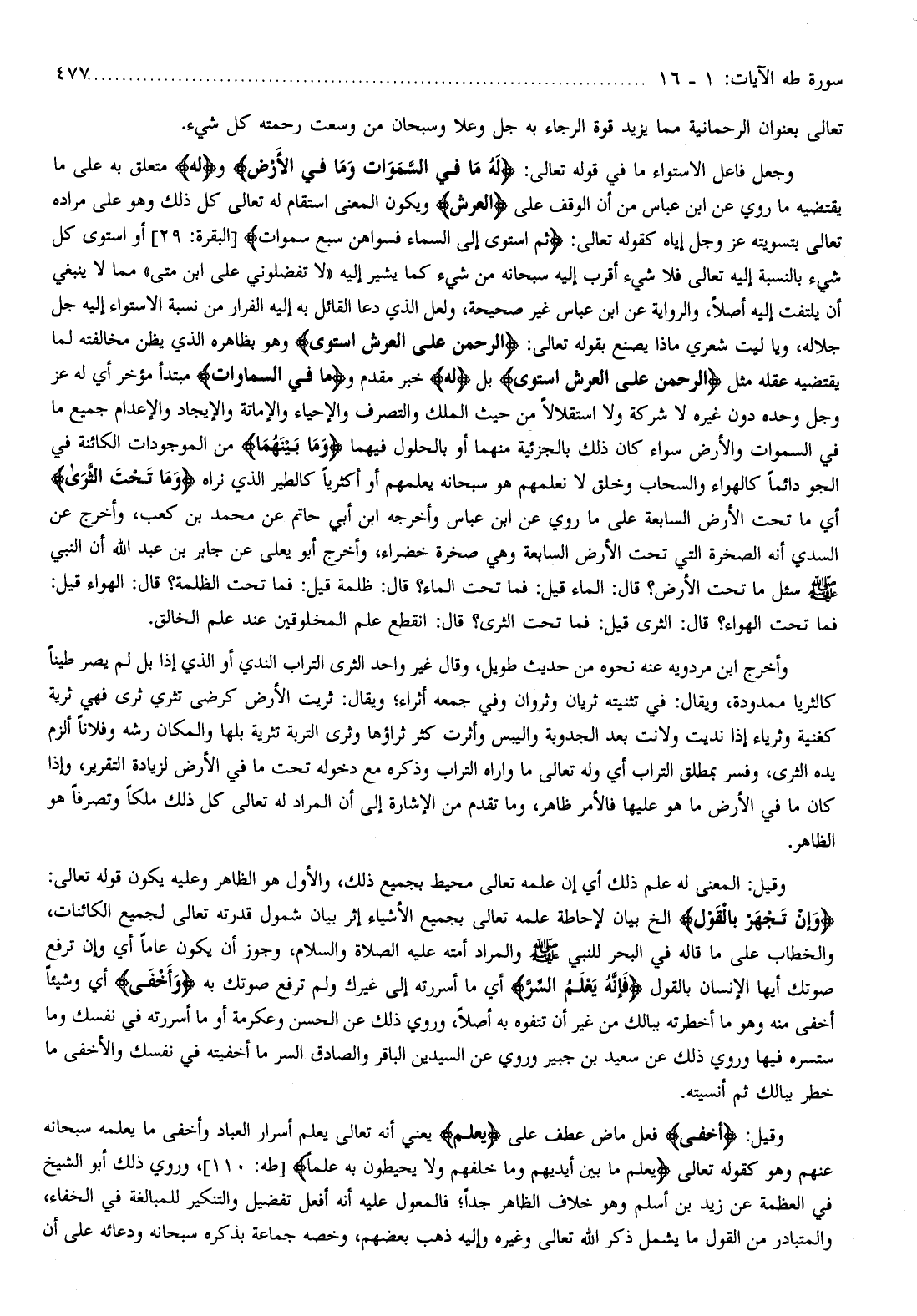 مما لا ينبغي أن يلتفت إليه أصلا، والرواية عن ابن عباس غير صحيحة، ولعل الذي دعا القائل به إليه الفرار من نسبة الاستواء إليه جل جلاله، ويا ليت شعري ماذا يصنع بقوله تعالى: الرَّحْمنُ عَلَى الْعَرْشِ اسْتَوى وهو بظاهره الذي يظن مخالفته لما يقتضيه عقله مثل الرَّحْمنُ عَلَى الْعَرْشِ اسْتَوى بل لَهُ خبر مقدم وما فِي السَّماواتِ مبتدأ مؤخر أي له عز وجل وحده دون غيره لا شركة ولا استقلالا من حيث الملك والتصرف والإحياء والإماتة والإيجاد والإعدام جميع ما في السموات والأرض سواء كان ذلك بالجزئية منهما أو بالحلول فيهما وَما بَيْنَهُما من الموجودات الكائنة في الجو دائما كالهواء والسحاب وخلق لا نعلمهم هو سبحانه يعلمهم أو أكثريا كالطير الذي نراه وَما تَحْتَ الثَّرى أي ما تحت الأرض السابعة على ما روي عن ابن عباس وأخرجه ابن أبي حاتم عن محمد بن كعب، وأخرج عن السدي أنه الصخرة التي تحت الأرض السابعة وهي صخرة خضراء،