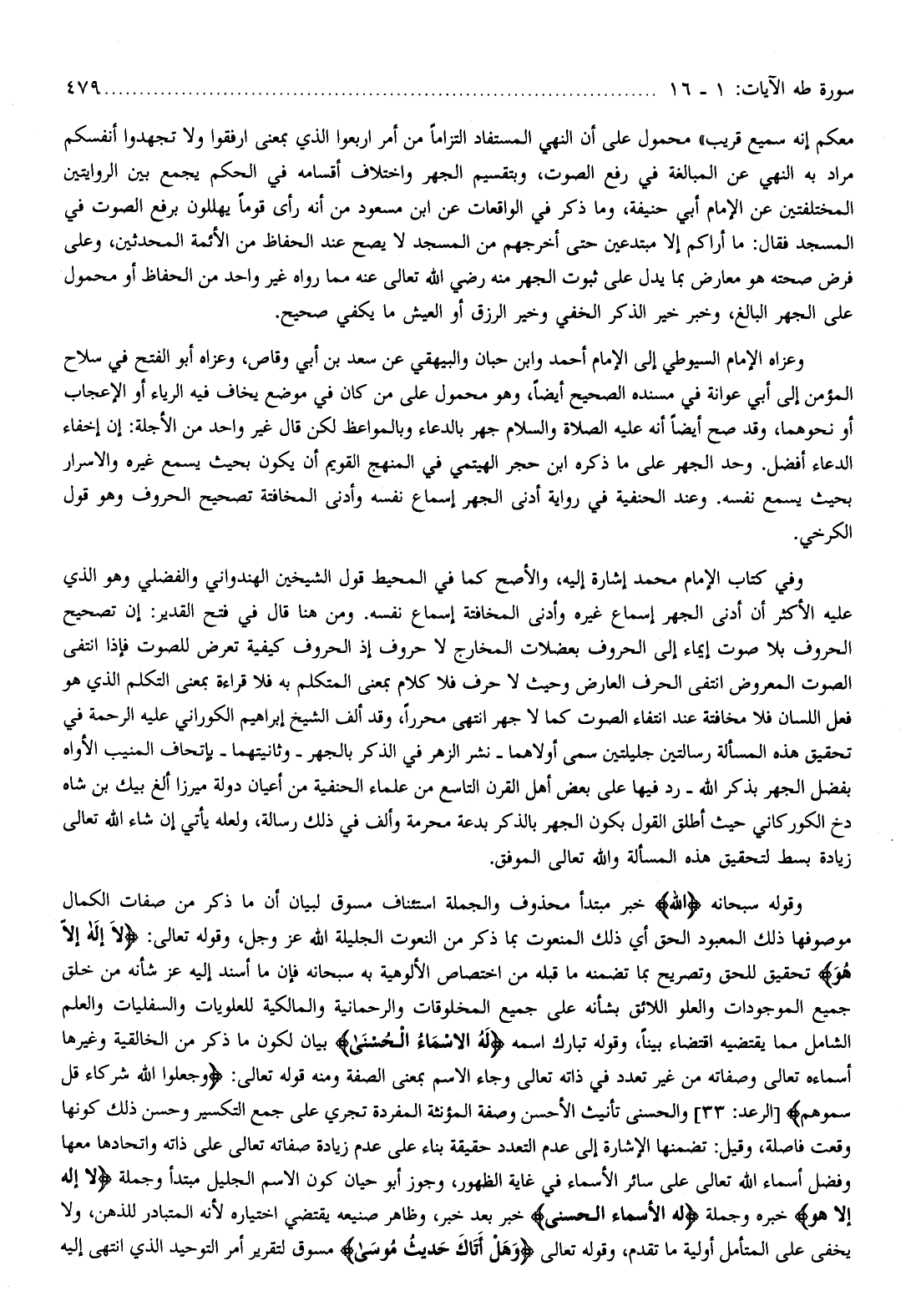 وفي كتاب الإمام محمد إشارة إليه، والأصح كما في المحيط قول الشيخين الهندواني والفضلي وهو الذي عليه الأكثر أن أدنى الجهر إسماع غيره وأدنى المخافتة إسماع نفسه. ومن هنا قال في فتح القدير: إن تصحيح الحروف بلا صوت إيماء إلى الحروف بعضلات المخارج لا حروف إذ الحروف كيفية تعرض للصوت فإذا انتفى الصوت المعروض انتفى الحرف العارض وحيث لا حرف فلا كلام بمعنى المتكلم به فلا قراءة بمعنى التكلم الذي هو فعل اللسان فلا مخافتة عند انتفاء الصوت كما لا جهر انتهى محررا، وقد ألف الشيخ إبراهيم الكوراني عليه الرحمة في تحقيق هذه المسألة رسالتين جليلتين سمى أولاهما- نشر الزهر في الذكر بالجهر- وثانيتهما- بإتحاف المنيب الأواه بفضل الجهر بذكر الله- رد فيها على بعض أهل القرن التاسع من علماء الحنفية من أعيان دولة ميرزا ألغ بيك بن شاه دخ الكوركاني حيث أطلق القول بكون الجهر بالذكر بدعة محرمة وألف في ذلك رسالة، ولعله يأتي إن شاء الله تعالى زيادة بسط لتحقيق هذه المسألة والله تعالى الموفق.